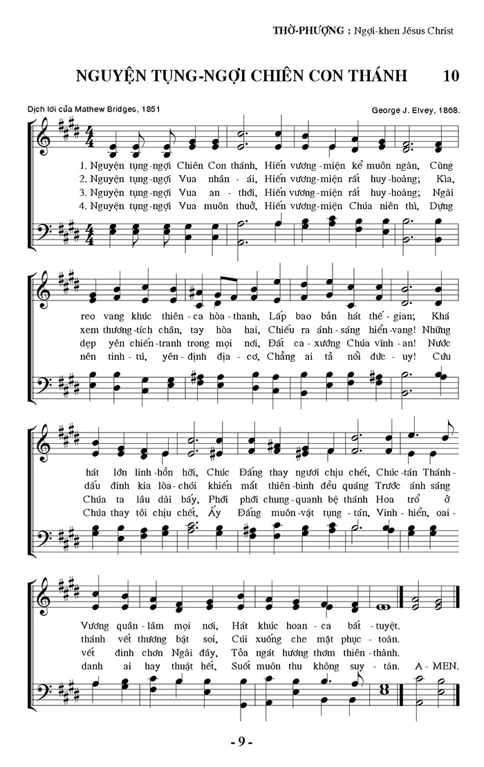 1. Nguyện tụng -ngợi Chiên Con thánh, Hiến vương miện kể muôn ngàn, Cùng reo vang khúc thiên - ca hòa - thanh, Lấp bao bản hát thế - gian; Khá hát lớn linh hồn hởi, Chúc Đấng thay ngươi chịu chết, Chúc tán Thánh - Vương quân - lâm mọi nơi, Hát khúc hoan ca bất - tuyệt. 2. Nguyện tụng -ngợi Vua nhân - ái, Hiến vương miện rất huy hoàng; Kìa, xem thương tích chân, tay hòa hai, Chiếu ra ánh sáng hiển-vang! Những dấu đinh kia lòa- chói khiến mất thiên-binh đều quáng Trước ánh sáng thánh vết thương bật soi, Cúi xuống che mặt phục toàn. 3. Nguyện tụng -ngợi Vua an - thơi, Hiến vương miện rất huy hoàng; Ngài dẹp yên chiến tranh trong mọi nơi, Đất ca - xướng Chúa vĩnh - an! Nước Chúa ta lâu dài bấy, Phơi phới chung quanh bệ thánh Hoa trổ Ở vết đinh chơn Ngài đây, Tỏa ngát hương thơm thiên - thành. 4. Nguyện tụng ngợi Vua muôn thuở, Hiến vương miện Chúa niên thì, Dựng nên tinh tú, yên định địa - cơ, Chẳng ai tả nổi đức uy! Cứu Chúa thay tôi chịu chết, Ấy Đấng muôn vật tụng - tán, Vinh - hiển, oai - danh ai hay thuật hết, Suốt muôn thu không suy tàn. A - MEN.
