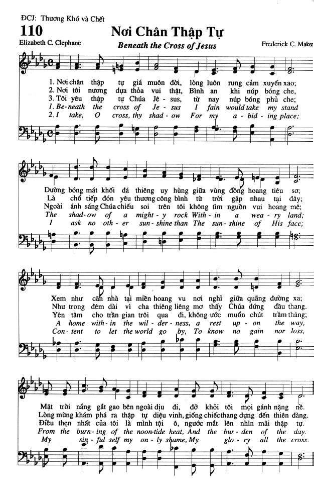 1. Nơi chân thập tự giá muôn đời, lòng luôn rung cảm xuyến xao; Dường bóng mát khối đá thiêng uy hùng giữa vùng đồng hoang tiêu sơ; Xem như căn nhà tại miền hoang vu nơi nghĩ giữa quãng đường xa; Mặt trời nắng gắt gao bên ngoài dịu đi, đỡ khỏi tôi mọi gánh nặng nề. 2. Nơi tôi nương dựa thỏa vui thật, Bình an khi núp bóng che, Là chỗ tiếp đón yêu thương công bình từ trời gặp nhau tại đây; Như trong đêm dài vì cha thiêng liêng mơ thấy Chúa đứng đầu thang. Lòng mừng khám phá ra thập tự diệu vinh, giống chiếc thang dựng đến thiên đàng. 3. Tôi yêu thập tự Chúa Jê-sus, từ nay núp bóng phủ che; Ngoài ánh sáng Chúa chiếu soi trên tôi không tìm nguồn vui hoang mê; Yên tâm cho trần gian trôi qua đi, không ước muốn chút trầm thăng; Điều thẹn nhất của tôi là mình tội ô, ngước mắt lên nhìn mãi thập tự.