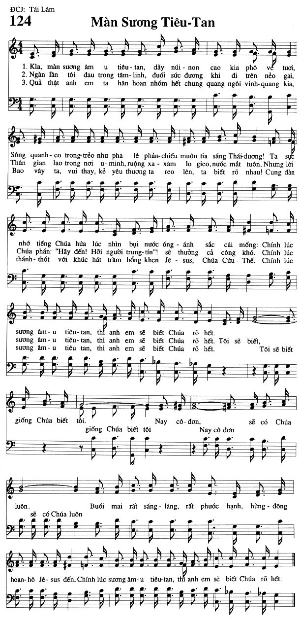 1. Kìa, màn sương âm u tiêu tan, dãy núi non cao kia phô về tươi, Sông quanh co trong trẻo như pha lê phản chiếu muôn tia sáng Thái dương! Ta sực nhớ tiếng Chúa hứa lúc nhìn bụi nước óng ánh sắc cái mống: Chính lúc sương âm-u tiêu-tan, thì anh em sẽ biết Chúa rõ hết. Tôi sẽ biết, giống Chúa biết tôi. Nay cô đơn, sẽ có Chúa luôn. Buổi mai rất sáng láng, rất phước hạnh, hừng đông hoan hô Jê-sus đến, Chính lúc sương âm-u tiêu tan, thì anh em sẽ biết Chúa rõ hết. 2. Ngàn lần tôi đau trong tâm linh, đuối sức đương khi đi trên nẻo gai, Thân gian lao trong nơi u-minh, ruộng xa xăm lo gieo, nước mắt tuôn, Nhưng lời Chúa phán: "Hãy đến! Hỡi người trung-tín!" sẽ thưởng cả công khó. Chính lúc sương âm-u tiêu tan, thì anh em sẽ biết Chúa rõ hết. Tôi sẽ biết, giống Chúa biết tôi. Nay cô đơn, sẽ có Chúa luôn. Buổi mai rất sáng láng, rất phước hạnh, hừng đông hoan hô Jê-sus đến, Chính lúc sương âm-u tiêu tan, thì anh em sẽ biết Chúa rõ hết. 3. Quả thật anh em ta hân hoan nhóm hết chung quang ngôi vinh-quang kia, Bao vây ta, vui thay, kẻ yêu thương ta reo lên, ta biết rõ nhau! Cung đàn thánh-thót với khúc hát trầm bổng khen Jê-sus, Chúa Cứu-Thế. Chính lúc sương âm-u tiêu tan, thì anh em sẽ biết Chúa rõ hết. Tôi sẽ biết, giống Chúa biết tôi. Nay cô đơn, sẽ có Chúa luôn. Buổi mai rất sáng láng, rất phước hạnh, hừng đông hoan hô Jê-sus đến, Chính lúc sương âm-u tiêu tan, thì anh em sẽ biết Chúa rõ hết.