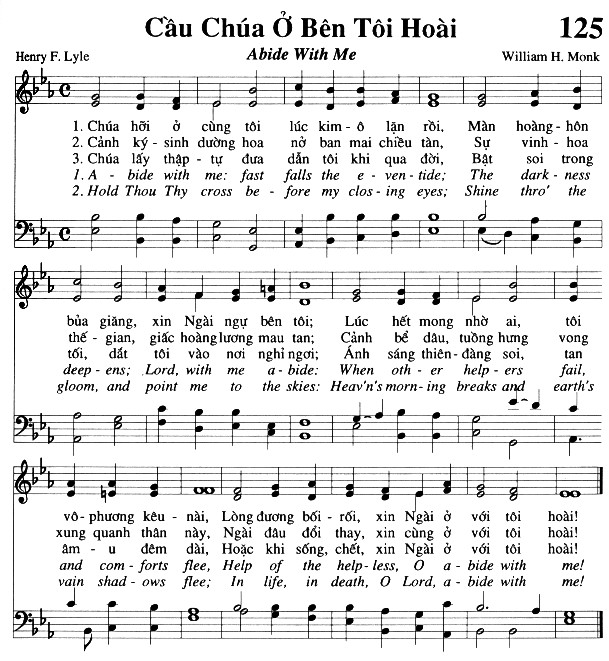1. Chúa hỡi ở cùng tôi lúc kim-ô lặn rồi, Màn hoàng-hôn bủa giăng, xin Ngài ngự bên tôi; Lúc hết mong nhờ ai, tôi vô-phương kêu nài, Lòng đương bối rối, xin Ngài ở với tôi hoài! Abide with me: fast falls the e-ven-tide; The dark-ness deep-ens; Lord, with me a-bide: When oth-er help-ers fail, and com-forts flee, Help of the help-less, O a-bide with me! 2. Cảnh ký-sinh dường hoa nở ban mai chiều tàn, Sự vinh-hoa thế-gian, giấc hoàng lương mau tan; Cảnh bể dâu, tuồng hưng xung quanh thân này, Ngài đâu đổi thay, xin cùng ở với tôi hoài! Hold Thou Thy cross be-fore my clos-ing eyes; Heav'n's morn-ing breaks and earth's vain shad-ows flee; In life, in death, O Lord, a-bide with me! 3. Chúa lấy thập-tự đưa dẫn tôi khi qua đời, Bật soi trong tối, dắt tôi vào nơi nghỉ ngơi; Ánh sáng thiên-đàng soi, âm u đêm dài, Hoặc khi sống, chết, xin Ngài ở với tôi hoài!