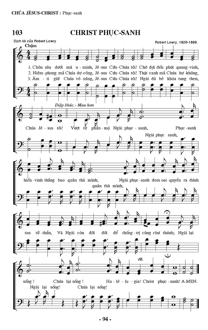 1. Chôn sâu dưới mã u-minh, Jê-sus Cứu-Chúa tôi! Chờ đợi đến phút quang-vinh, hiển-vinh thắng bao quân thù mình; tan tử-thần, Và Ngài còn đời đời để thống-trị cùng chư thánh; Ngài lại sống! 2. Niêm-phong mả Chúa dư-công, Jê-sus Cứu-Chúa tôi! Thật canh mả Chúa hư-không, Ngài phục-sanh đem oai-quyền ra đánh quân thù mình; tan tử-thần, Và Ngài còn đời đời để thống-trị cùng chư thánh; Ngài lại sống! 3. Âm-ti giữ Chúa vô-năng, Jê-sus Cứu-Chúa tôi! Ngài đã bẻ khóa tung then, Ngài phục-sanh đem oai-quyền ra đánh quân thù mình; tan tử-thần, Và Ngài còn đời đời để thống-trị cùng chư thánh; Ngài lại sống! Điệp khúc: Chúa Jê-sus tôi! Vượt từ phần-mộ Ngài phục-sanh, Phục-sanh Ngài phục-sanh, Ha-lê-lu-gia! Christ phục-sanh! A-MEN. Chúa lại sống! Chúa lại sống!