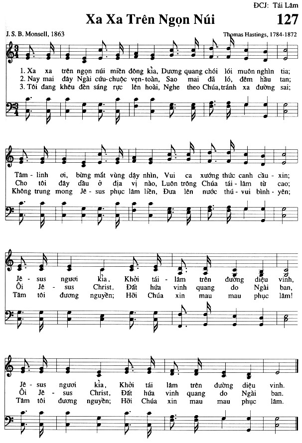 1. Xa xa trên ngọn núi miền đông kìa, Dương quang chói lói muôn nghìn tia; Tâm linh ơi, bừng mắt vùng dậy nhìn, Vui ca xướng thức canh cầu xin; Je sus ngươi kia. Khởi tái lâm trên đường diệu vinh. 2. Nay mai đây Ngài cứu chuộc vẹn toàn, Sao mai đã ló, đêm hầu tan; Cho tôi đây đâu ở địa vị nào, Luôn trông Chúa tái lâm từ cao; Ôi Je sus Christ, Đất hứa vinh quang do Ngài ban. 3. Tôi đang khêu đèn sáng rực lên hoài, Nghe theo Chúa, tránh xa đường sai; Không trung mong Je sus phục lâm liền, Đưa lên nước thú vui bình yên; Tâm tôi đương nguyền; Hỡi Chúa xin mau mau phục lâm! Điệp khúc: Je sus ngươi kia, Khởi tái lâm trên đường diệu vinh. Ôi Je sus Christ, Đất hứa vinh quang do Ngài ban. Tâm tôi đương nguyền; Hỡi Chúa xin mau mau phục lâm.