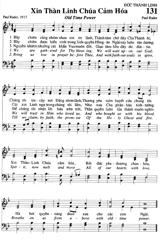 1. Bầy chiên cùng nhóm nhau xin ơn lành, Thành tâm chờ đây Cha Thánh ôi; Chúng tôi tin cậy nơi Đấng nhơn lành, Thương yêu tuôn huyết cứu chúng tôi. 2. Bầy chiên được hiển vinh trong linh-quyền Hồng ân Ngài nay luôn tán dương; Cúi xin Linh ngự trong chúng tôi liền, Như xưa Cha phán-hứa tỉnh-tường. 3. Nguyền khiêm nhường cúi khẩn Vua muôn đời, Giục tâm hồn đây do đức tin. Để chúng tôi nhận lời hứa trên trời, Thần quyền luôn lửa thánh muôn nghìn. Điệp khúc: Xin Thần Linh Chúa cảm hóa, Bởi đức yêu thương chan hòa, Hà hơi quyền năng thuở xưa cho các con Ngài.