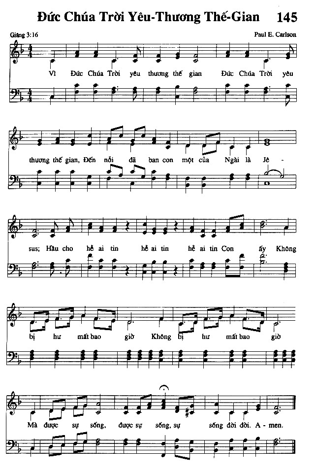 1. Vì Đức Chúa Trời yêu thương thế gian, Đức Chúa Trời yêu thương thế gian, Đến nỗi đã ban con một của Ngài là Jesus; Hầu cho hễ ai tin hễ ai tin hễ ai tin Con ấy Không bị hư mất bao giờ Không bị hư mất bao giờ Mà được sự sống, được sự sống, sự sống đời đời. A - men.