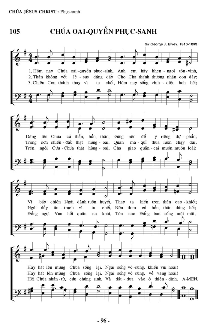 1. Hôm nay Chúa oai-quyền phục sinh, Anh em hãy khen ngợi tôn vinh, Dâng lên Chúa cả thần, hồn, thân, Đừng nên để ý riêng dự phần; Vì bầy chiên Ngài đành tuôn huyết, Thay ta hiến trọn thân cao - khiết; 2. Thân không vết Jêsus dâng đấy Cho Cha thánh thương nhận con đây; Trong cơn chiến đấu thật hùng oai, Quân ma quỉ thua luôn chạy dài; Ngài đầy ân trạch vì ta chết, Nên đem cả hồn, thân dâng hết; 3. Chiên Con thánh thay vì ta chết, Hôm nay sống vinh diệu hơn hết; Trên ngôi Cứu Chúa thật hùng oai, Cha giao quản cai muốn muôn loài; Đồng ngợi Vua hồi quân ca khải, Tôn cao Đấng ban sống mãi mãi; Điệp khúc: Hãy hát lên mừng Chúa sống lại, Ngài sống vô cùng, khiến vui hoài! Hãy hát lên mừng Chúa sống lại, Ngài sống vô cùng, vẻ vang hoài! Hỡi Chúa nhân từ, cứu chúng sinh, Và dắt đưa vào ở thiên đình. A-MEN.