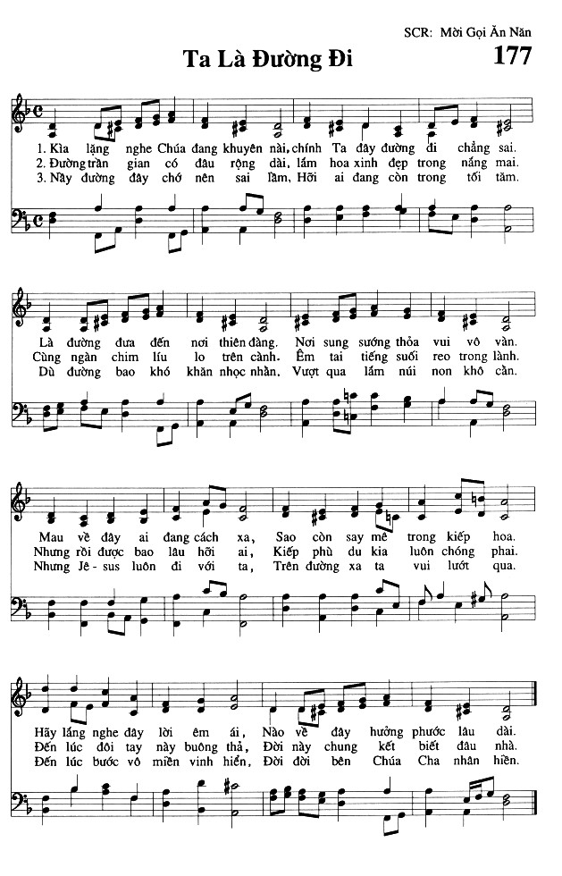 1. Kìa lặng nghe Chúa đang khuyên nài, chính Ta đây đường đi chẳng sai. Là đường đưa đến nơi thiên đàng. Nơi sung sướng thỏa vui vô vàn. Mau về đây ai đang cách xa, Sao còn say mê trong kiếp hoa. Hãy lắng nghe đây lời êm ái, Nào về đây hưởng phước lâu dài. 2. Đường trần gian có đâu rộng dài, lắm hoa xinh đẹp trong nắng mai. Cùng ngàn chim líu lo trên cành. Êm tai tiếng suối reo trong lành. Nhưng rồi được bao lâu hỡi ai, Kiếp phù du kia luôn chóng phai. Đến lúc đôi tay này buông thả, Đời này chung kết biết đâu nhà. 3. Này đường đây chớ nên sai lầm, Hỡi ai đang còn trong tối tăm. Dù đường bao khó khăn nhọc nhằn. Vượt qua lắm núi non khô cần. Nhưng Jêsus luôn đi với ta, Trên đường xa ta vui lướt qua. Đến lúc bước vô miền vinh hiển, Đời đời bên Chúa Cha nhân hiền.