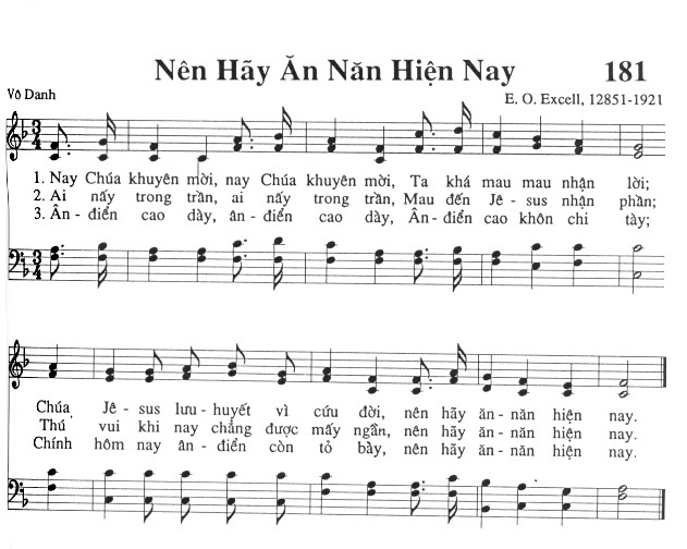 1. Nay Chúa khuyên mời, nay Chúa khuyên mời, Ta khá mau mau nhận lời; Chúa Jê-sus lưu-huyết vì cứu đời, nên hãy ăn-năn hiện nay. 2. Ai nấy trong trần, ai nấy trong trần, Mau đến Jê-sus nhận phần; Thú vui khi nay chẳng được mấy ngần, nên hãy ăn-năn hiện nay. 3. Ân-điển cao dày, ân-điển cao dày, Ân-điển cao khôn chi tày; Chính hôm nay ân-điển còn tỏ bày, nên hãy ăn-năn hiện nay.