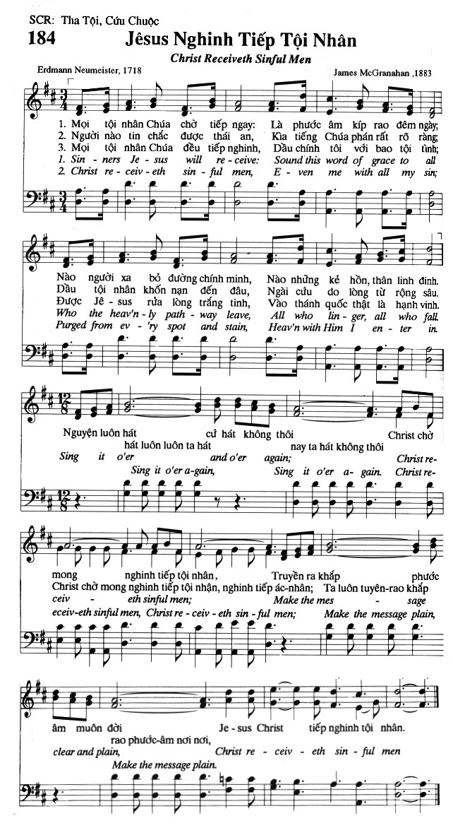 1. Mọi tội nhân Chúa chờ tiếp ngay: Là phước âm kíp rao đêm ngày; Nào người xa bỏ đường chính minh, Who the heav'nly pathway leave, 2. Người nào tin chắc được thái an, Kìa tiếng Chúa phán rất rõ ràng, Dầu tội nhân khốn nạn đến đâu, Purged from ev 'ry spot and stain, 3. Mọi tội nhân Chúa đều tiếp nghinh, Dầu chính tôi với bao tội tình; Được Jê-sus rửa lòng trắng tinh, Heav'n with Him I enter in. Điệp khúc: Nguyện luôn hát cứ hát không thôi hát luôn luôn ta hát nay ta hát không thôi Sing it o'er and o'er again; Sing it o'er a-gain, Sing it o'er a-gain. Christ chờ mong nghinh tiếp tội nhân, Christ chờ mong nghinh tiếp tội nhân, nghinh tiếp ác nhân; Make the message plain, Ta luôn tuyên-rao khắp phước âm muôn đời rao phước-âm nơi nơi, Je-sus Christ tiếp nghinh tội nhân. Make the message plain.