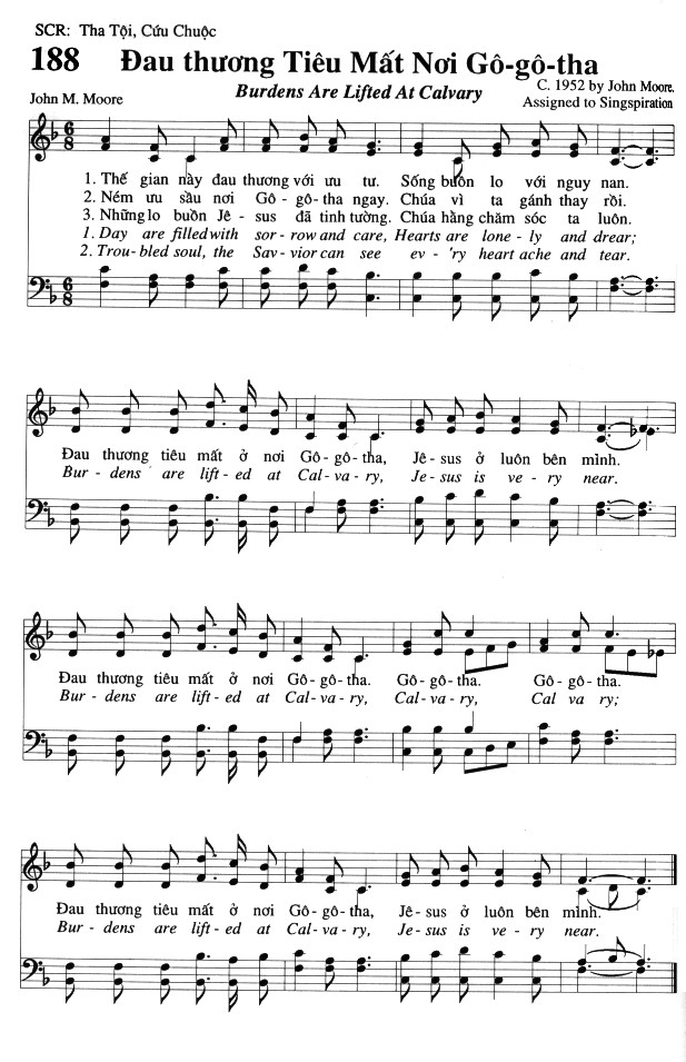 1. Thế gian này đau thương với ưu tư. Sống buồn lo với nguy nan. Day are filled with sorrow and care, Hearts are lonely and drear; 2. Ném ưu sầu nơi Gô-gô-tha ngay. Chúa vì ta gánh thay rồi. Troubled soul, the Savior can see ev'ry heart ache and tear. 3. Những lo buồn Jêsus đã tỉnh tường. Chúa hằng chăm sóc ta luôn. Điệp khúc: Đau thương tiêu mất ở nơi Gô-gô-tha, Jêsus ở luôn bên mình. Burdens are lifted at Calvary, Jesus is very near. Đau thương tiêu mất ở nơi Gô-gô-tha. Gô-gô-tha. Gô-gô-tha. Burdens are lifted at Cal-va-ry, Cal-va-ry, Cal-va-ry; Đau thương tiêu mất ở nơi Gô-gô-tha, Jê-sus ở luôn bên mình. Burdens are lifted at Calvary, Je-sus is very near.