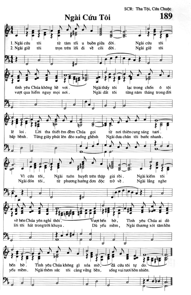 1. Ngài cứu tôi từ tăm tối u buồn giữa đời. Ngài cứu tôi tình yêu Chúa không hề vơi. Ngài thấy tôi lạc trong chốn ô tội lẽ loi. Lời tha thiết êm đềm Chúa gọi từ nơi thiên cung sáng tươi. Vì cứu tôi, Ngài tuôn huyết trên thập giá rồi. Ngài kiếm tôi về bên Chúa yên nghỉ thôi. Vượt bến bờ, Tình yêu Chúa ai dò bến bờ. Tình yêu Chúa không gì xóa mờ, đã cứu tôi tự do. 2. Ngài giữ tôi trọn trên lối đi về cõi đời. Ngài giữ tôi vượt qua hiểm nguy mọi nơi. Ngài dắt tôi từng năm tháng trong đời bấp bềnh. Từng giây phút lên đèo xuống ghềnh Ngài đưa chân tôi bước nhanh. Ngài đón tôi, từ phương hướng đơn độc trở về. Ngài lắng nghe lời tôi hát trong trời khuya. Dù yếu mềm, Ngài thương xót tâm hồn yếu mềm. Ngài thêm sức tôi càng vững bền, sống vui tươi hồn nhiên.