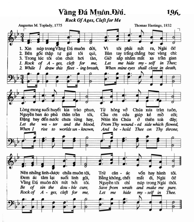 1. Xin núp trong Vầng Đá muôn đời, Vì tôi phải nứt ra, Ngài ôi! Lòng mong suối huyết kia trào phun, Từ hông vỡ Chúa xưa tràn tuôn, Nên những linh-dược chữa muôn tội, Trừ căn ác vốn hay hành tôi. Rock of A-ges, cleft for me, Let me hide my-self in Thee; Let the wa-ter and the blood, From Thy wound-ed side which flowed, Be of sin the dou-ble cure, Let me hide my-self in Thee. 2. Bên gốc thập tự giá tôi quì, Bàn tay trắng chẳng bạc vàng chi: Nguyền ban áo phủ thân trần tôi, Cầu ơn cứu giúp kẻ mồ côi; Đem ác tâm lại suối linh gội, Bằng không, chết mất đi, Ngài ôi! While I draw this fleet-ing breath, When mine eyes shall close in death, When I rise to worlds un-known, And be-hold Thee on Thy throne, Save from wrath and make me pure. 3. Trong lúc tôi còn chút hơi tàn, Giờ sắp nhắm mắt xa trần gian Đặng bay đến nước chưa từng hay, Nhìn lên Chúa ở thiên toà đây; Vầng Đá muôn đời nứt bởi tôi. Nguyền tôi chỉ núp trong Ngài thôi.