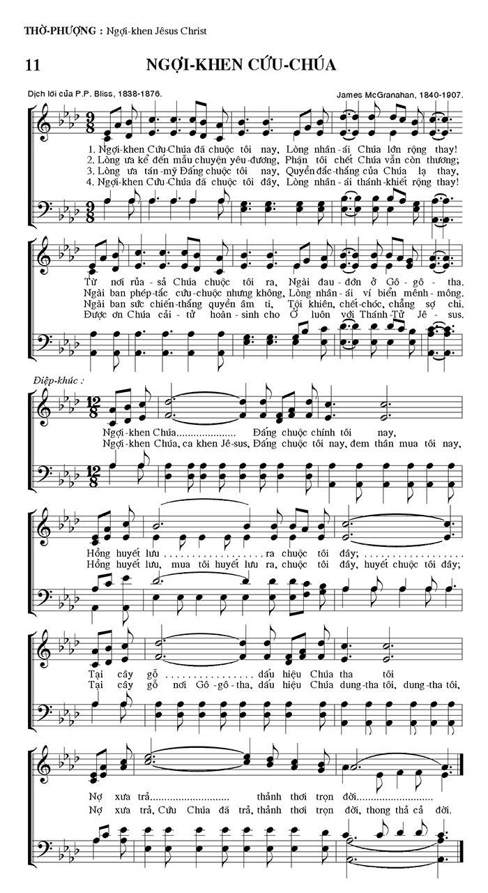 1. Ngợi khen Cứu Chúa đã chuộc tôi nay, Lòng nhân ái Chúa lớn rộng thay! Từ nơi rủa sả Chúa chuộc tôi ra, Ngài đau đớn ở Gô gô tha. Nợ xưa trả, thánh thơi trọn đời... 2. Lòng ưa kể đến mẫu chuyện yêu đương, Phận tôi chết Chúa vẫn còn thương; Ngài ban phép tắc cứu chuộc nhưng không, Lòng nhân ái ví biển mênh mông. Nợ xưa trả, Cứu Chúa đã trả, thảnh thơi trọn đời, thong thả cả đời. 3. Lòng ưa tán -mỹ Đấng chuộc tôi nay, Quyền đắc thắng của Chúa lạ thay, Ngài ban sức chiến thắng quyền âm ti, Tội khiên, chết chóc, chẳng sợ chi. Nợ xưa trả, thánh thơi trọn đời... 4. Ngợi khen Cứu Chúa đã chuộc tôi đây, Lòng nhân - ái thánh khiết rộng thay! Được ơn Chúa cải tử hoàn sinh cho Ở luôn với Thánh Tử Jê sus. Nợ xưa trả, Cứu Chúa đã trả, thảnh thơi trọn đời, thong thả cả đời. Điệp khúc: Ngợi khen Chúa............ Đấng chuộc chính tôi nay, Ngợi khen Chúa, ca khen Jê-sus, Đấng chuộc tôi nay, đem thân mua tôi nay, Hồng huyết lưu............ ra chuộc tôi đây; Hồng huyết lưu, mua tôi huyết lưu ra, chuộc tôi đây, huyết chuộc tôi đây; Tại cây gỗ............ dấu hiệu Chúa tha tôi Tại cây gỗ nơi Gô-gô- tha, dấu hiệu Chúa dung-tha tôi, dung tha tôi,