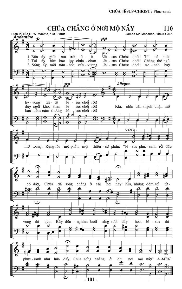1. Bữa ấy giữa trưa trời ủ ê Jê-sus Christ chết! Tất cả mối hy vọng tái tê Jê-sus chết rồi! mở toang, Rạng-lòa mộ phần, một thiên sứ phán: "Jê-sus phục-sanh rồi đâu có đây, Chúa đã sống chẳng ở chi nơi nầy! Kìa, những đêm tối tử vong đà qua, Rày đón nghinh buổi sáng tươi đầy hoa, Jê-sus đà phục-sanh như hứa đấy, Chúa sống chẳng ở chi nơi mộ nầy" A-MEN. 2. Tối ấy biết bao lụy chứa-chan Jê-sus Christ chết! Chẳng thế ngủ duy ngồi khóc-than Jê-sus chết rồi! mở toang, Rạng-lòa mộ phần, một thiên sứ phán: "Jê-sus phục-sanh rồi đâu có đây, Chúa đã sống chẳng ở chi nơi nầy! Kìa, những đêm tối tử vong đà qua, Rày đón nghinh buổi sáng tươi đầy hoa, Jê-sus đà phục-sanh như hứa đấy, Chúa sống chẳng ở chi nơi mộ nầy" A-MEN. 3. Sáng ấy mỗi tâm hồn vấn vương Jê-sus Christ chết! Áo-não bấy bao niềm cảm thương Jê-sus chết rồi! mở toang, Rạng-lòa mộ phần, một thiên sứ phán: "Jê-sus phục-sanh rồi đâu có đây, Chúa đã sống chẳng ở chi nơi nầy! Kìa, những đêm tối tử vong đà qua, Rày đón nghinh buổi sáng tươi đầy hoa, Jê-sus đà phục-sanh như hứa đấy, Chúa sống chẳng ở chi nơi mộ nầy" A-MEN. Điệp khúc: Kìa, nhìn bàn thạch chặn mồ
