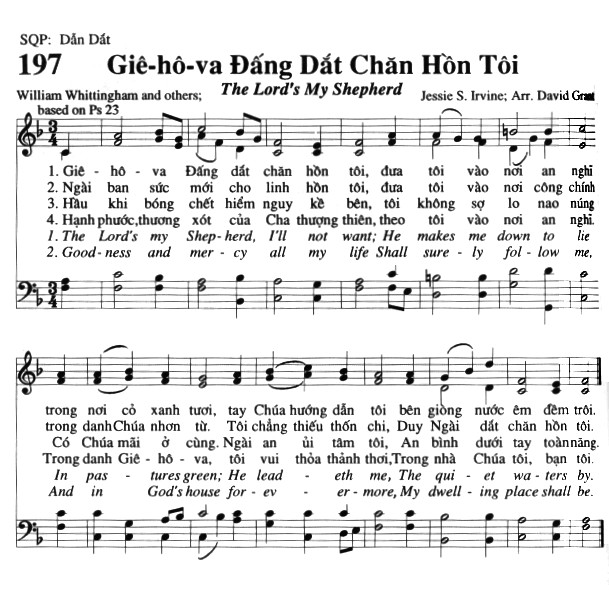 1. Giê-hô-va Đấng dắt chăn hồn tôi, đưa tôi vào nơi an nghỉ trong nơi cỏ xanh tươi, tay Chúa hướng dẫn tôi bên giòng nước êm đềm trôi. The Lord's my Shepherd, I'll not want; He makes me down to lie In pastures green; He leadeth me, The quiet waters by. 2. Ngài ban sức mới cho linh hồn tôi, đưa tôi vào nơi công chính trong danh Chúa nhơn từ. Tôi chẳng thiếu thốn chi, Duy Ngài dắt chăn hồn tôi. Goodness and mercy all my life Shall surely follow me, And in God's house for evermore, My dwelling place shall be. 3. Hầu khi bóng chết hiểm nguy kề bên, tôi không sợ lo nao núng Có Chúa mãi ở cùng. Ngài an ủi tâm tôi, An bình dưới tay toàn năng. 4. Hạnh phước, thương xót của Cha thượng thiên, theo tôi vào nơi an nghỉ. Trong danh Giê-hô-va, tôi vui thỏa thảnh thơi, Trong nhà Chúa tôi, bạn tôi.
