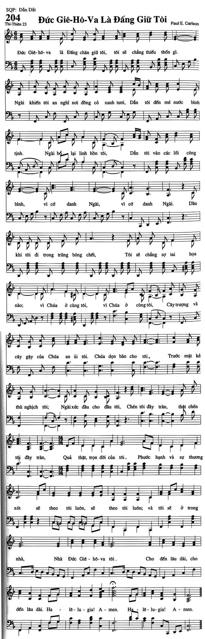 1. Đức Giê-hô-va là Đấng chăn giữ tôi, tôi sẽ chẳng thiếu thốn gì. Ngài khiến tôi an nghỉ nơi đồng cỏ xanh tươi, Dẫn tôi đến mé nước bình tịnh. Ngài bổ lại linh hồn tôi, Dẫn tôi vào các lối công bình, vì cớ danh Ngài, vì cớ danh Ngài. Dầu khi tôi đi trong trũng bóng chết, Tôi sẽ chẳng sợ tai họa nào; vì Chúa ở cùng tôi, vì Chúa ở cùng tôi, Cây trượng và cây gậy của Chúa an ủi tôi. Chúa dọn bàn cho tôi, Trước mặt kẻ thù nghịch tôi; Ngài xức dầu cho đầu tôi, Chén tôi đầy tràn, thật chén tôi đầy tràn, Quả thật, trọn đời của tôi, Phước hạnh và sự thương xót sẽ theo tôi luôn, sẽ theo tôi luôn; và tôi sẽ ở trong nhà, Nhà Đức Giê-hô-va tôi. Cho đến lâu dài, cho đến lâu dài. Ha-lê-lu-gia! A-men. Ha-lê-lu-gia! A-men.
