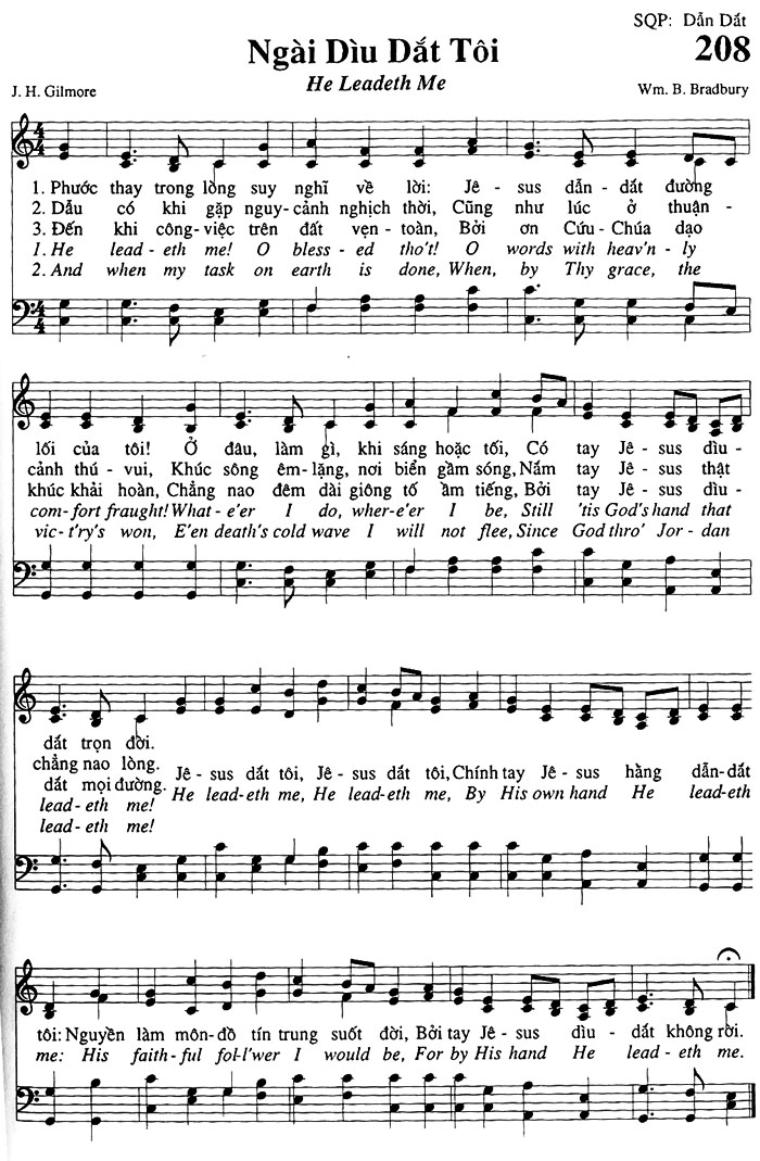 1. Phước thay trong lòng suy nghĩ về lời: Jê-sus dẫn-dắt đường lối của tôi! Ở đâu, làm gì, khi sáng hoặc tối, Có tay Jê-sus dìu-dắt trọn đời. 2. Dẫu có khi gặp nguy-cảnh nghịch thời, Cũng như lúc ở thuận-cảnh thú-vui, Khúc sông êm-lặng, nơi biển gầm sóng, Nắm tay Jê-sus thật chẳng nao lòng. 3. Đến khi công-việc trên đất vẹn-toàn, Bởi ơn Cứu-Chúa dạo khúc khải hoàn, Chẳng nao đêm dài giông tố ầm tiếng, Bởi tay Jê-sus dìu-dắt mọi đường. Điệp khúc: Jê-sus dắt tôi, Jê-sus dắt tôi, Chính tay Jê-sus hằng dẫn-dắt tôi: Nguyền làm môn-đồ tín trung suốt đời, Bởi tay Jê-sus dìu-dắt không rời.