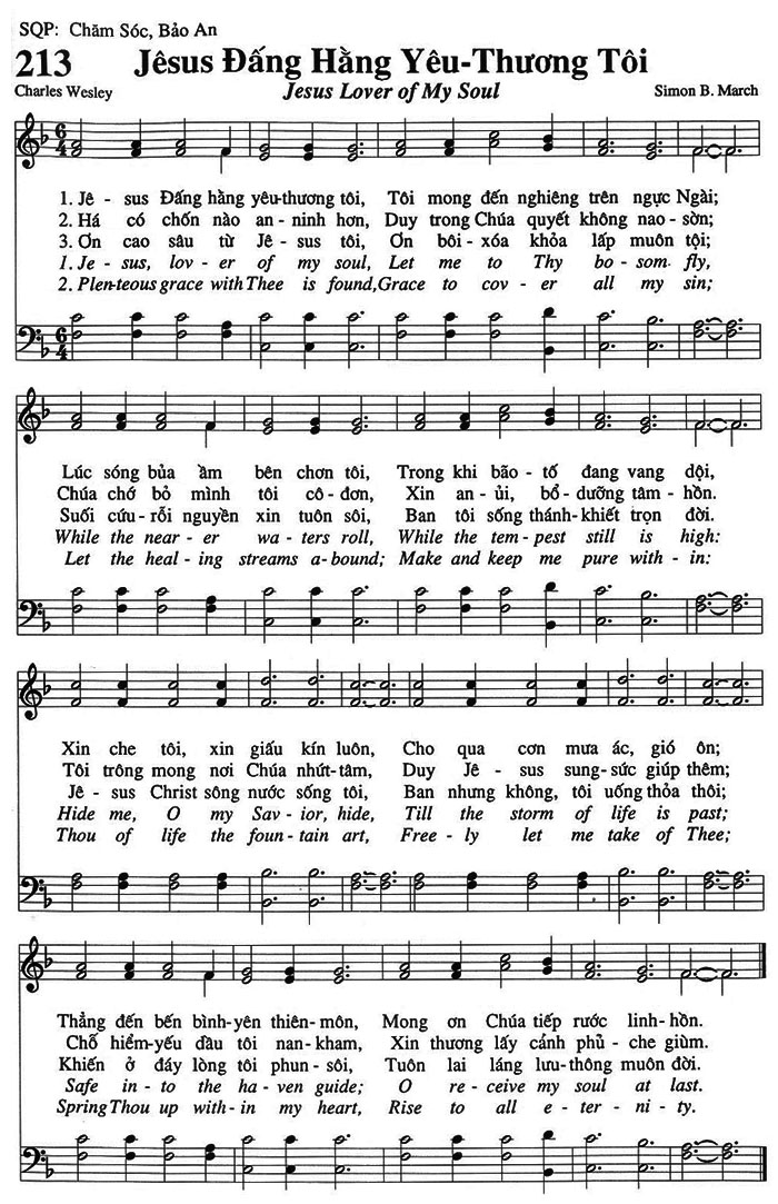 1. Jêsus Đấng hằng yêu thương tôi, Lúc sóng bủa ầm bên chơn tôi, Xin che tôi, xin giấu kín luôn, Thẳng đến bến bình yên thiên-môn, Jêsus, lover of my soul, Let me to Thy bo-som fly, While the near-er waters roll, Hide me, O my Savior, hide, Safe in-to the haven guide; 2. Há có chốn nào an ninh hơn, Chúa chớ bỏ mình tôi cô-đơn, Tôi trông mong nơi Chúa nhứt-tâm, Chỗ hiểm yếu đầu tôi nan-kham, Plenteous grace with Thee is found, Grace to cov-er all my sin; While the tem-pest still is high: Till the storm of life is past; O re-ceive my soul at last. 3. Ơn cao sâu từ Jêsus tôi, Ơn bôi xóa khỏa lấp muôn tội; Trong khi bão tố đang vang dội, Xin an ủi, bổ dưỡng tâm-hồn. Cho qua cơn mưa ác, gió ôn; Duy Jêsus sung-sức giúp thêm; Mong ơn Chúa tiếp rước linh-hồn. Xin thương lấy cánh phủ che giùm. Let the heal-ing streams a-bound; Make and keep me pure with-in: Thou of life the foun-tain art, Free-ly let me take of Thee; Spring Thou up with-in my heart, Rise to all e-ter-ni-ty.