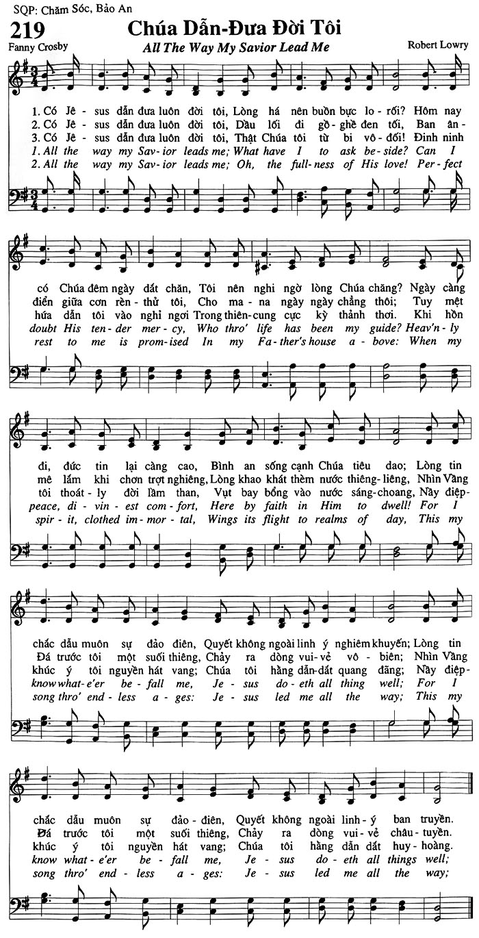 1. Có Jê-sus dẫn đưa luôn đời tôi, Lòng há nên buồn bực lo-rối? Hôm nay có Chúa đêm ngày dắt chăn, Tôi nên nghi ngờ lòng Chúa chăng? Ngày càng đi, đức tin lại càng cao, Bình an sống cạnh Chúa tiêu dao; Lòng tin chác dẫu muôn sự đảo điên, Quyết không ngoài linh ý nghiêm khuyến; Lòng tin biết rằng Chúa tôi hằng dẫn dắt quang đãng; Này điệp-khúc ý tôi nguyền hát vang; Chúa tôi hằng dẫn dắt huy hoàng. 2. Có Jê-sus dẫn đưa luôn đời tôi, Dầu lối đi gồ-ghề đen tối, Ban ân-điển giữa cơn rèn-thử tôi, Cho ma-na ngày ngày chẳng thôi; Tuy mệt mê lắm khi chơn trợt nghiêng, Lòng khao khát thèm nước thiêng-liêng, Nhìn Vàng Đá trước tôi một suối thiêng, Chảy ra dòng vui-vẻ vô biên; Nhìn Vàng biết rằng Chúa tôi hằng dẫn dắt quang đãng; Này điệp-khúc ý tôi nguyền hát vang; Chúa tôi hằng dẫn dắt huy hoàng. 3. Có Jê-sus dẫn đưa luôn đời tôi, Thật Chúa tôi từ bi vô-đối! Đinh ninh hứa dẫn tôi vào nghỉ ngơi Trong thiên-cung cực kỳ thảnh thơi. Khi hồn tôi thoát-ly đời lầm than, Vụt bay bổng vào nước sáng-choang, Này điệp-chắc dẫu muôn sự đảo điên, Quyết không ngoài linh ý ban truyền. biết rằng Chúa tôi hằng dẫn dắt quang đãng; Này điệp-khúc ý tôi nguyền hát vang; Chúa tôi hằng dẫn dắt huy hoàng. Điệp khúc: chắc dẫu muôn sự đảo-điên, Quyết không ngoài linh ý ban truyền. Đá trước tôi một suối thiêng, Chảy ra dòng vui-vẻ châu-tuyền. khúc ý tôi nguyền hát vang; Chúa tôi hằng dẫn dắt huy hoàng.