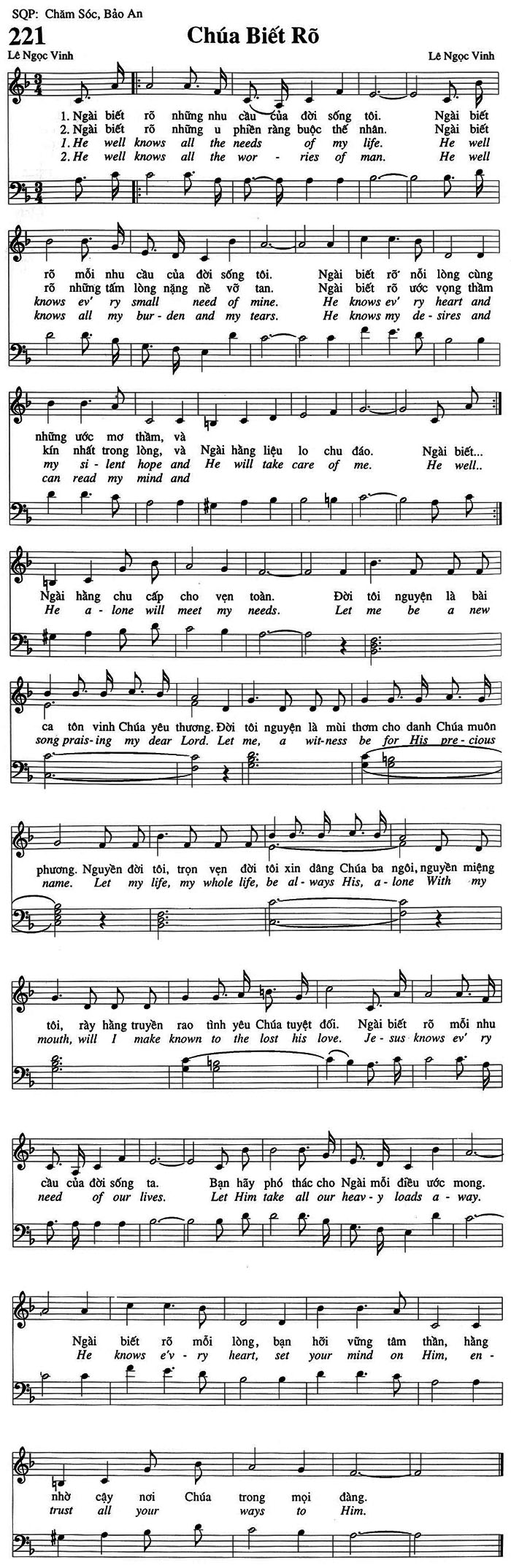 1. Ngài biết rõ những nhu cầu của đời sống tôi. Ngài biết rõ nỗi lòng cùng những ước mơ thầm, và Ngài hằng liệu lo chu đáo. Ngài hằng chu cấp cho vẹn toàn. Đời tôi nguyện là bài ca tôn vinh Chúa yêu thương. Đời tôi nguyện là mùi thơm cho danh Chúa muôn phương. Nguyền đời tôi, trọn vẹn đời tôi xin dâng Chúa ba ngôi, nguyền miệng tôi, rày hằng truyền rao tình yêu Chúa tuyệt đối. 2. Ngài biết rõ những u phiền ràng buộc thế nhân. Ngài biết rõ những tấm lòng nặng nề vỡ tan. Ngài biết rõ ước vọng thầm kín nhất trong lòng, và Ngài hằng liệu lo chu đáo. Ngài hằng chu cấp cho vẹn toàn. Đời tôi nguyện là bài ca tôn vinh Chúa yêu thương. Đời tôi nguyện là mùi thơm cho danh Chúa muôn phương. Nguyền đời tôi, trọn vẹn đời tôi xin dâng Chúa ba ngôi, nguyền miệng tôi, rày hằng truyền rao tình yêu Chúa tuyệt đối. Điệp khúc: Ngài biết rõ mỗi nhu cầu của đời sống ta. Bạn hãy phó thác cho Ngài mỗi điều ước mong. Ngài biết rõ mỗi lòng, bạn hỡi vững tâm thần, hàng nhờ cậy nơi Chúa trong mọi đàng.