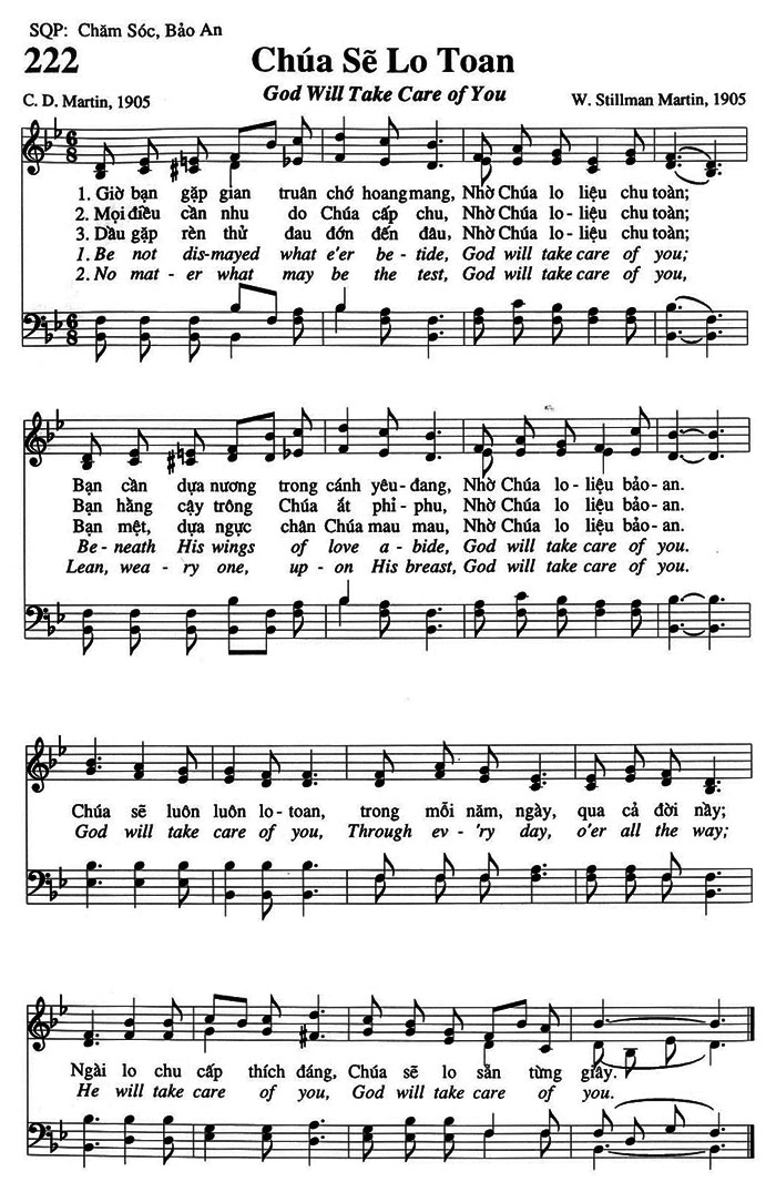 1. Giờ bạn gặp gian truân chớ hoang mang, Nhờ Chúa lo liệu chu toàn; Bạn cần dựa nương trong cánh yêu-đang, Nhờ Chúa lo-liệu bảo-an. Be not dis-mayed what e'er be-tide, God will take care of you; Beneath His wings of love a-bide, God will take care of you. 2. Mọi điều cần nhu do Chúa cấp chu, Nhờ Chúa lo-liệu chu toàn; Bạn hằng cậy trông Chúa ất phi-phu, Nhờ Chúa lo liệu bảo-an. No mat-ter what may be the test, God will take care of you, Lean, wea-ry one, up-on His breast, God will take care of you. 3. Dầu gặp rèn thử đau đớn đến đâu, Nhờ Chúa lo-liệu chu toàn; Bạn mệt, dựa ngực chân Chúa mau mau, Nhờ Chúa lo liệu bảo-an. Điệp khúc: Chúa sẽ luôn luôn lo toan, trong mỗi năm, ngày, qua cả đời này; Ngài lo chu cấp thích đáng, Chúa sẽ lo sẵn từng giây. God will take care of you, Through ev-'ry day, o'er all the way; He will take care of you, God will take care of you.