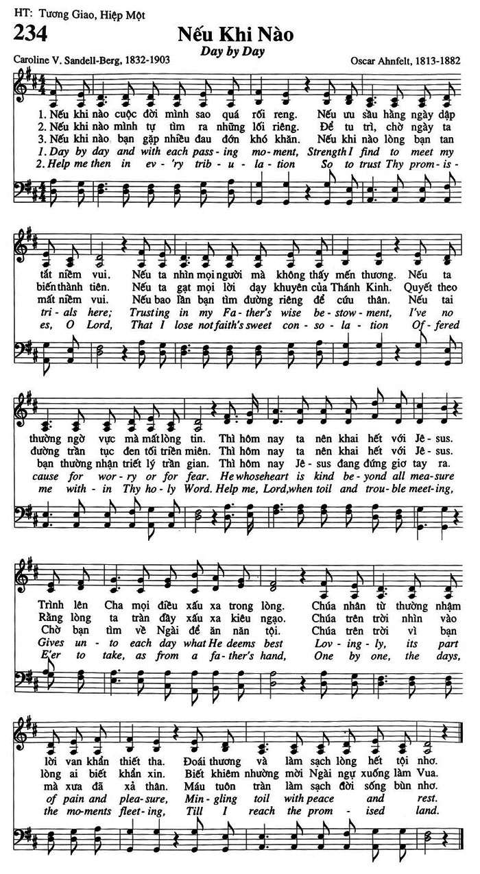 1. Nếu khi nào cuộc đời mình sao quá rối reng. Nếu ưu sầu hằng ngày dập tắt niềm vui. Nếu ta nhìn mọi người mà không thấy mến thương. Nếu ta thường ngờ vực mà mất lòng tin. Thì hôm nay ta nên khai hết với Jê-sus. Trình lên Cha mọi điều xấu xa trong lòng. Chúa nhân từ thường nhậm lời van khẩn thiết tha. Đoái thương và làm sạch lòng hết tội nhơ. 2. Nếu khi nào mình tự tìm ra những lối riêng. Để tu trì, chờ ngày ta biến thành tiên. Nếu ta gạt mọi lời dạy khuyên của Thánh Kinh. Quyết theo đường trần tục đen tối triền miên. Thì hôm nay ta nên khai hết với Jê-sus. Rằng lòng ta tràn đầy xấu xa kiêu ngạo. Chúa trên trời nhìn vào lòng ai biết khẩn xin. Biết khiêm nhường mời Ngài ngự xuống làm Vua. 3. Nếu khi nào bạn gặp nhiều đau đớn khó khăn. Nếu khi nào lòng bạn tan mất niềm vui. Nếu bao lần bạn tìm đường riêng để cứu thân. Nếu tai bạn thường nhận triết lý trần gian. Thì hôm nay Jê-sus đang đứng giơ tay ra. Chờ bạn tìm về Ngài để ăn năn tội. Chúa trên trời vì bạn mà xưa đã xả thân. Máu tuôn tràn làm sạch đời sống bùn nhơ.