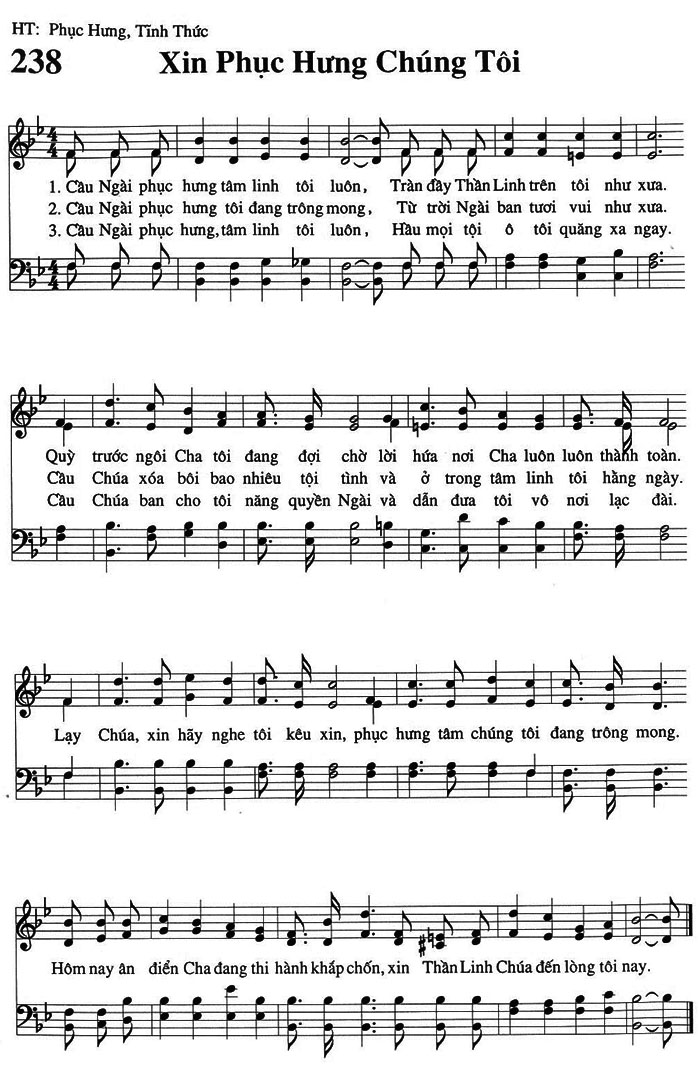1. Cầu Ngài phục hưng tâm linh tôi luôn, Quỳ trước ngôi Cha tôi đang đợi chờ lời hứa nơi Cha luôn luôn thành toàn. Lạy Chúa, xin hãy nghe tôi kêu xin, phục hưng tâm chúng tôi đang trông mong. Hôm nay ân điển Cha đang thi hành khắp chốn, xin Thần Linh Chúa đến lòng tôi nay. 2. Cầu Ngài phục hưng tôi đang trông mong, Cầu Chúa xóa bôi bao nhiêu tội tình và ở trong tâm linh tôi hằng ngày. Lạy Chúa, xin hãy nghe tôi kêu xin, phục hưng tâm chúng tôi đang trông mong. Hôm nay ân điển Cha đang thi hành khắp chốn, xin Thần Linh Chúa đến lòng tôi nay. 3. Cầu Ngài phục hưng, tâm linh tôi luôn, Cầu Chúa ban cho tôi năng quyền Ngài và dẫn đưa tôi vô nơi lạc đài. Lạy Chúa, xin hãy nghe tôi kêu xin, phục hưng tâm chúng tôi đang trông mong. Hôm nay ân điển Cha đang thi hành khắp chốn, xin Thần Linh Chúa đến lòng tôi nay. Điệp khúc: Tràn đầy Thần Linh trên tôi như xưa. Từ trời Ngài ban tươi vui như xưa. Hầu mọi tội ô tôi quăng xa ngay.
