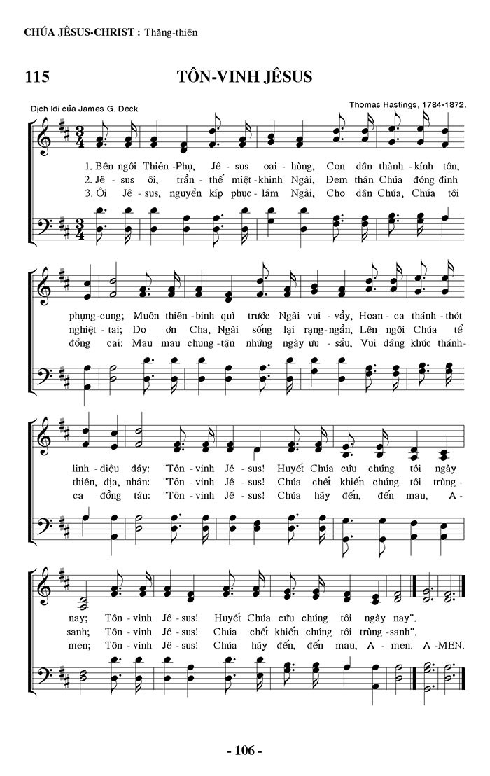1. Bên ngôi Thiên - Phụ, Jêsus oai - hùng, Con dân thành - kính tôn, phụng - cung; Muôn thiên - binh quì trước Ngài vui - vầy, Hoan - ca thánh - thót linh - diệu đây: "Tôn vinh Jêsus! Huyết Chúa cứu chúng tôi ngày nay; Tôn vinh Jê-sus! Huyết Chúa cứu chúng tôi ngày nay". 2. Jê - sus ôi, trần - thế miệt - khinh Ngài, Đem thân Chúa đóng đinh nghiệt - tai; Do ơn Cha, Ngài sống lại rạng - ngần, Lên ngôi Chúa tể thiên, địa, nhân: "Tôn vinh Jêsus! Chúa chết khiến chúng tôi trùng - sanh; Tôn vinh Jêsus! Chúa chết khiến chúng tôi trùng sanh". 3. Ôi Jê - sus, nguyền kíp phục - lâm Ngài, Cho dân Chúa, Chúa tôi đồng cai: Mau mau chung - tận những ngày ưu - sầu, Vui dâng khúc thánh- ca đồng tâu: "Tôn vinh Jêsus! Chúa hãy đến, đến mau, A- men; Tôn vinh Jê-sus! Chúa hãy đến, đến mau, A men. AMEN.