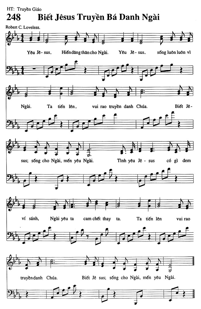 1. Yêu Jê-sus, Hiến dâng thân cho Ngài. Yêu Jê-sus, sống luôn luôn vì Ngài. Ta tiến lên, vui rao truyền danh Chúa. Biết Jê-sus; sống cho Ngài, mến yêu Ngài. Tình yêu Jê-sus có gì đem ví sánh, Ngài yêu ta cam chết thay ta. Ta tiến lên vui rao truyền danh Chúa. Biết Jê-sus; sống cho Ngài, mến yêu Ngài.