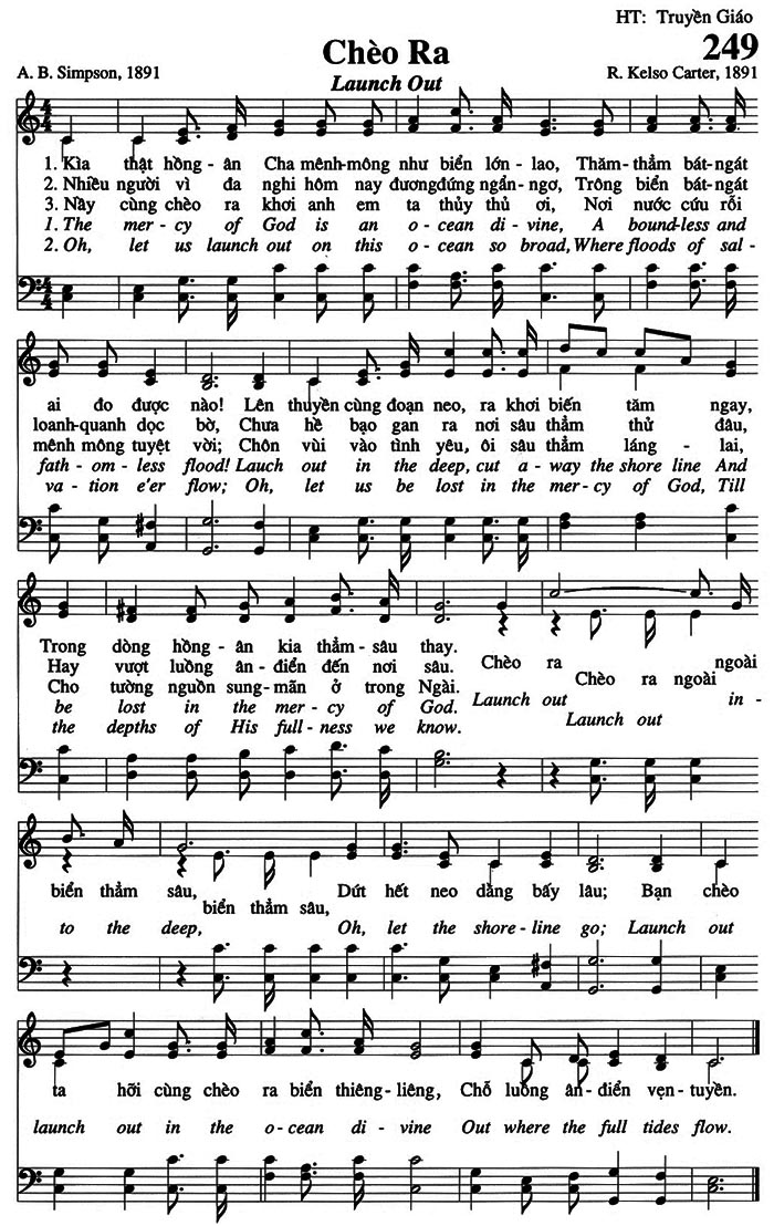 1. Kìa thật hồng - ân Cha mênh mông như biển lớn - lao, Thăm thẳm bát ngát ai đo được nào! Lên thuyền cùng đoạn neo, ra khơi biến tăm ngay, Trong dòng hồng ân kia thẳm - sâu thay. biển thẳm sâu, hỡi cùng chèo ra biển thiêng liêng, Chỗ luồng ân - điển vẹn - tuyền. 2. Nhiều người vì đa nghi hôm nay đương đứng ngẩn ngơ, Trông biển bát ngát loanh quanh dọc bờ, Chưa hề bạo gan ra nơi sâu thẳm thử đâu, Hay vượt luồng ân - điển đến nơi sâu. Chèo ra biển thẳm sâu, Dứt hết neo dằng bấy lâu; Bạn chèo ra biển thiêng liêng, Chỗ luồng ân - điển vẹn - tuyền. 3. Này cùng chèo ra khơi anh em ta thủy thủ ơi, Nơi nước cứu rỗi mênh mông tuyệt vời; Chôn vùi vào tình yêu, ôi sâu thẳm láng lai, Cho tường nguồn sung mãn ở trong Ngài. Chèo ra ngoài biển thẳm sâu, hỡi cùng chèo ra biển thiêng liêng, Chỗ luồng ân - điển vẹn - tuyền. Điệp khúc: The mer - cy of God is an o - cean di - vine, A bound-less and fath - om - less flood! Lauch out in the deep, cut a - way the shore line And be lost in the mer - cy of God, Till to the deep, Oh, let the shore - line go; Launch out in the o-cean di - vine Out where the full tides flow. Oh, let us launch out on this o - cean so broad, Where floods of sal - va - tion e'er flow; Oh, let us be lost in the depths of His full - ness we know. Launch out Launch out