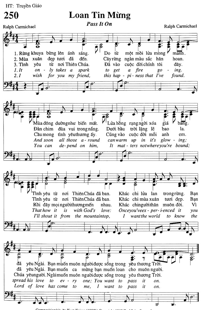 1. Rừng khuya bừng lên ánh sáng. Do từ một mồi lửa mong manh. Mùa đông dường như biến mất. Lửa hồng rạng ngời xóa giá băng. Tình yêu từ nơi Thiên Chúa đã ban. Khác chi lửa lan trong rừng. Bạn It only takes a spark to get a fire going. And soon all those around can warm up in it's glowing; That how it is with God's love: I'll shout it from the mountaintop, 2. Mùa xuân đẹp tươi đã đến. Cây rừng ngàn màu sắc hân hoan. Đàn chim đùa vui trong nắng. Dưới bầu trời lặng lẽ bao la. Tình yêu từ nơi Thiên Chúa đã ban. Khác chi mùa xuân tươi đẹp. Bạn I wish for you my friend, this happiness that I've found. You can depend on him, It matters not where you're bound; Once you've experienced it you I want the world to know the 3. Tình yêu từ nơi Thiên Chúa. Đã vào cuộc đời chính tôi đây. Cầu mong tình yêu thương ấy. Cũng vào cuộc đời mỗi anh em. Rồi đây mọi người thương mến nhau. Khác chi người thân muôn đời. Vì Điệp khúc: đã yêu Ngài. Bạn muốn muôn người được sống trong yêu thương Trời. đã yêu Ngài. Bạn muốn ca mừng bạn muốn loan cho muôn người. Chúa yêu người. Ngài muốn muôn người được sống trong yêu thương Trời. spread his love to every one; You want to pass it on. Lord of love has come to me, I want to pass it on.