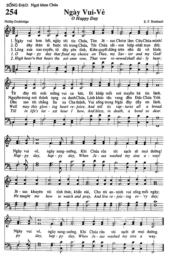 1. Ngày vui hơn hết, ngày tôi tin Chúa, Tôn Jêsus Christ làm Cứu Chúa mình! Từ đây tôi mãi mừng vui ca hát, Đi khắp mỗi nơi truyền bá tin lành. 2. O dây thân ái buộc tôi trong Chúa, Tôi Chúa sắt - son hiệp nhất trọn đời; Nguyền trong nơi thánh tụng ca danh Chúa, Linh khúc tấu vang đền Đức Chúa Trời. 3. Lòng xưa xao xuyến, từ đây yên tĩnh, Kiên quyết đứng trên nền đá vô hình; Dầu sao tôi chẳng lìa xa Cha thánh, Vui sống trong Ngài đầy dẫy ơn lành. Điệp khúc: Ngày vui vẻ, ngày sung sướng, Khi Chúa rửa tôi sạch sẽ mọi đường! Jêsus khuyên tôi tỉnh thức, khẩn nài, Cho tôi an ninh vui sống mỗi ngày; Ngày vui vẻ, ngày sung sướng, Khi Chúa rửa tôi sạch sẽ mọi đường.
