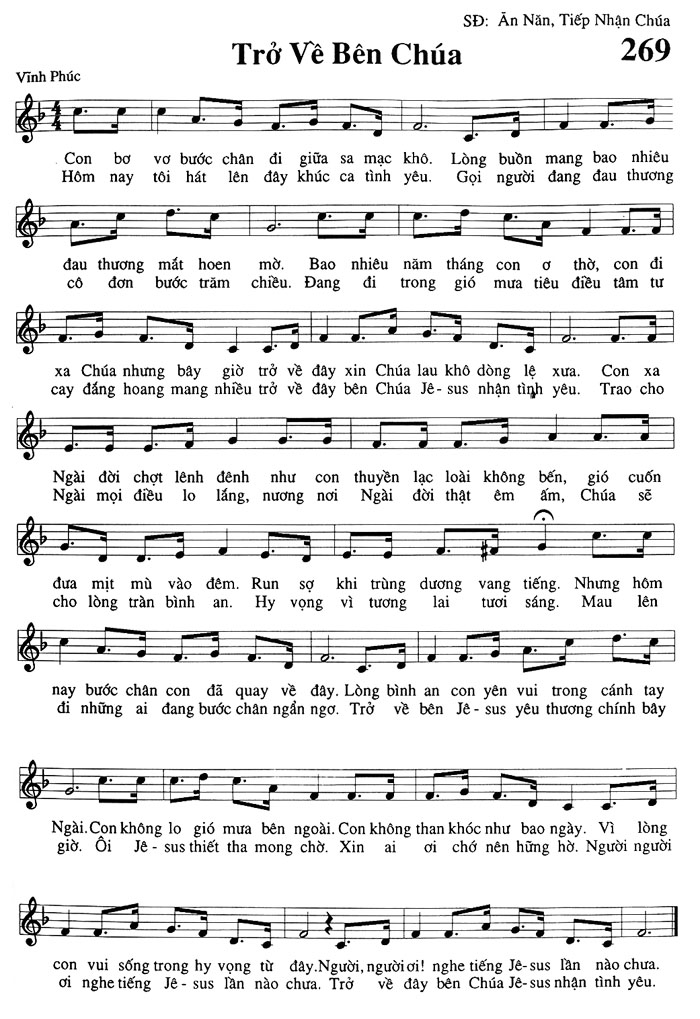 1. Con bơ vơ bước chân đi giữa sa mạc khô. Lòng buồn mang bao nhiêu đau thương mắt hoen mờ. Bao nhiêu năm tháng con ơ thờ, con đi xa Chúa nhưng bây giờ trở về đây xin Chúa lau khô dòng lệ xưa. Ngài đời chợt lênh đênh như con thuyền lạc loài không bến, gió cuốn đưa mịt mù vào đêm. Run sợ khi trùng dương vang tiếng. Nhưng hôm nay bước chân con đã quay về đây. Lòng bình an con yên vui trong cánh tay Ngài. Con không lo gió mưa bên ngoài. Con không than khóc như bao ngày. Vì lòng con vui sống trong hy vọng từ đây. 2. Hôm nay tôi hát lên đây khúc ca tình yêu. Gọi người đang đau thương cô đơn bước trăm chiều. Đang đi trong gió mưa tiêu điều tâm tư cay đắng hoang mang nhiều trở về đây bên Chúa Jê-sus nhận tình yêu. Trao cho Ngài mọi điều lo lắng, nương nơi Ngài đời thật êm ấm, Chúa sẽ cho lòng tràn bình an. Hy vọng vì tương lai tươi sáng. Mau lên đi những ai đang bước chân ngẩn ngơ. Trở về bên Jê-sus yêu thương chính bây giờ. Ôi Jê-sus thiết tha mong chờ. Xin ai ơi chớ nên hững hờ. Người người ơi! nghe tiếng Jê-sus lần nào chưa. 3. Người, người ơi! nghe tiếng Jê-sus lần nào chưa. Trở về đây bên Chúa Jê-sus nhận tình yêu.