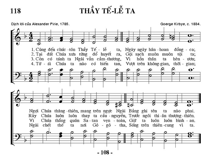 1. Cùng đến chúc tôn Thầy Tế - lễ ta, Ngày ngày hân hoan đồng ca; Ngợi Chúa thăng - thiên, mang trên ngực Ngài Bảng ghi tên ta nào phai. 2. Tại đất Chúa xưa từng đổ huyết ra, Gội sạch muôn muôn tội ta; Rày Chúa luôn luôn thay ta cầu nguyễn, Trước ngôi thi - ân thượng - thiên. 3. Còn có tánh ta Ngài vẫn cảm thương, Vì hồn thân ta hèn ươn; Vì Chúa thắng quân Sa-tan vẹn - toàn, Giữ ta luôn luôn bình an. 4. Từ ái Chúa ta nào có biến tan, Vượt trên không gian, thời gian; Ngài chết thế ta nơi Gô - gô - tha, Sống trên thiên - cung vì ta.