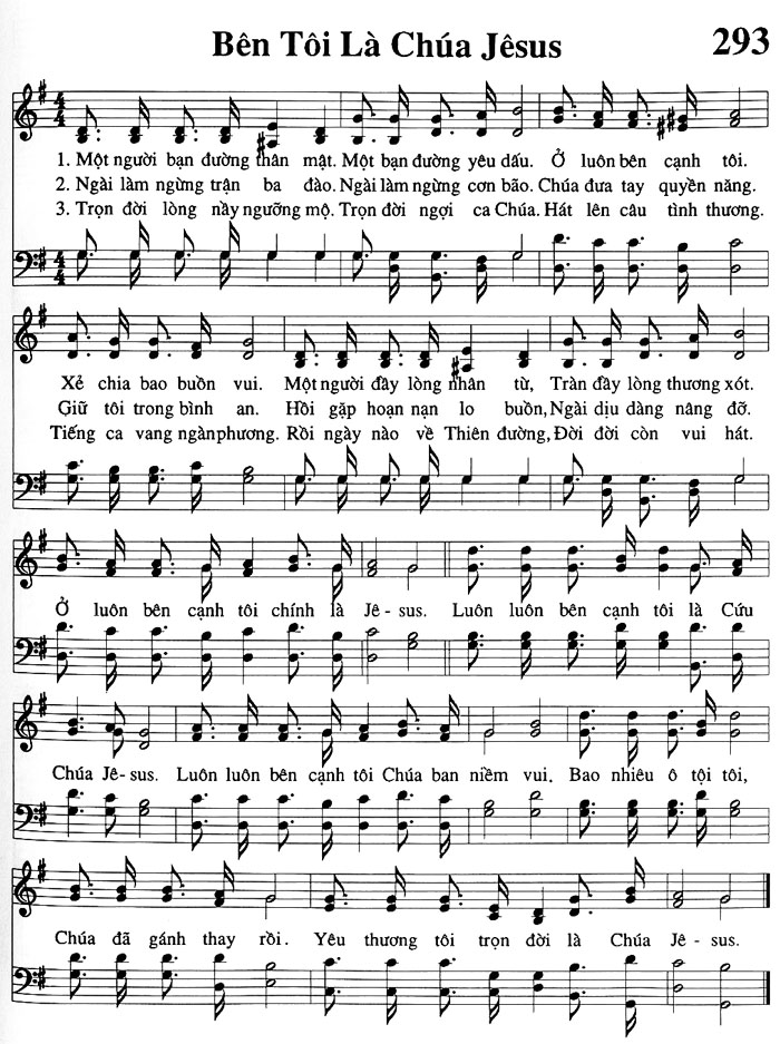 1. Một người bạn đường thân mật. Một bạn đường yêu dấu. Ở luôn bên cạnh tôi. Xẻ chia bao buồn vui. Một người đầy lòng nhân từ, Tràn đầy lòng thương xót. 2. Ngài làm ngừng trận ba đào. Ngài làm ngừng cơn bão. Chúa đưa tay quyền năng. Giữ tôi trong bình an. Hồi gặp hoạn nạn lo buồn, Ngài dịu dàng nâng đỡ. 3. Trọn đời lòng này ngưỡng mộ. Trọn đời ngợi ca Chúa. Hát lên câu tình thương. Tiếng ca vang ngànphương. Rồi ngày nào về Thiên đường, Đời đời còn vui hát. Điệp khúc: Ở luôn bên cạnh tôi chính là Jê-sus. Luôn luôn bên cạnh tôi là Cứu Chúa Jê-sus. Luôn luôn bên cạnh tôi Chúa ban niềm vui. Bao nhiêu ô tội tôi, Chúa đã gánh thay rồi. Yêu thương tôi trọn đời là Chúa Jê-sus.