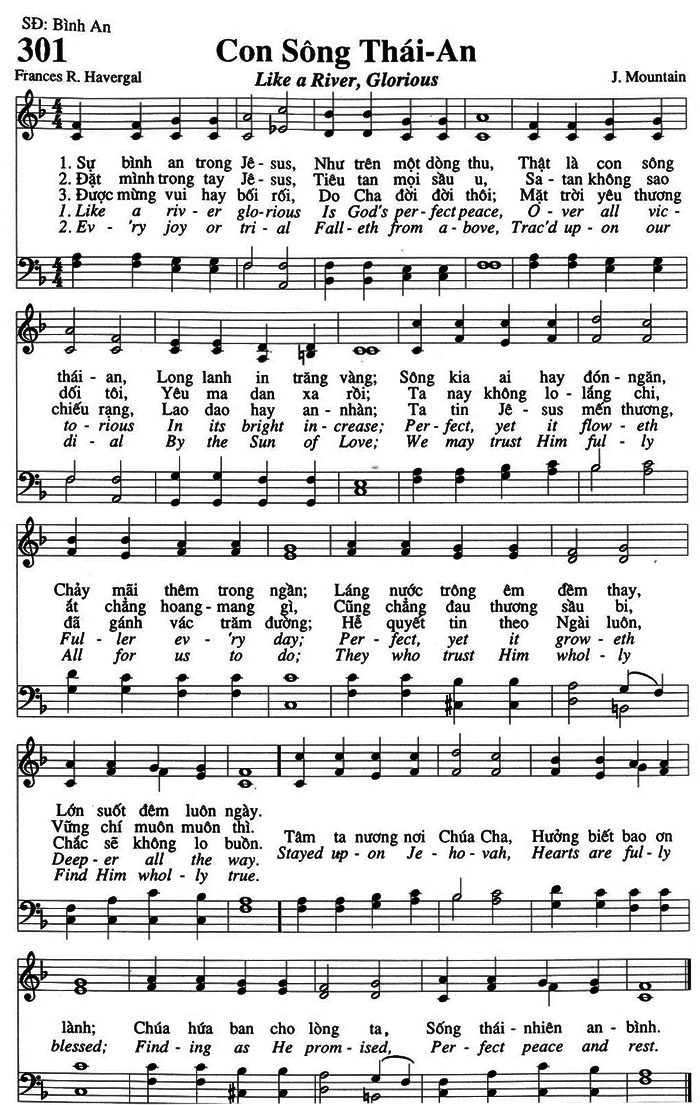 1. Sự bình an trong Jêsus, Như trên một dòng thu, Thật là con sông thái - an, Long lanh in trắng vàng; Sông kia ai hay đón ngăn, Chảy mãi thêm trong ngần; Láng nước trông êm đêm thay, Lớn suốt đêm luôn ngày. lành; 2. Đặt mình trong tay Jêsus, Tiêu tan mọi sầu u, Sa tan không sao dối tôi, Yêu ma dan xa rồi; Ta nay không lo lắng chi, ắt chẳng hoang - mang gì, Cũng chẳng đau thương sầu bi, Vững chí muôn muôn thì. Chúa hứa ban cho lòng ta, 3. Được mừng vui hay bối rối, Do Cha đời đời thôi; Mặt trời yêu thương chiếu rạng, Lao dao hay an nhàn; Ta tin Jêsus mến thương, đã gánh vác trăm đường; Hễ quyết tin theo Ngài luôn, Chắc sẽ không lo buồn. Tâm ta nương nơi Chúa Cha, Hưởng biết bao ơn Sống thái - nhiên an bình.