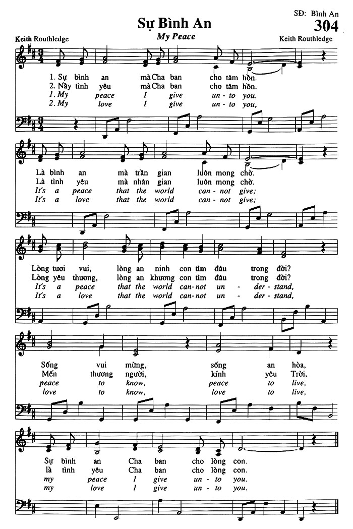 1. Sự bình an mà Cha ban cho tâm hồn. Là bình an mà trần gian luôn mong chờ. Lòng tươi vui, lòng an ninh con tìm đâu trong đời? Sống vui mừng, sống an hòa, Sự bình an Cha ban cho lòng con. 2. Này tình yêu mà Cha ban cho tâm hồn. Là tình yêu mà nhân gian luôn mong chờ. Lòng yêu thương, lòng an khương con tìm đâu trong đời? Mến thương người, kính yêu Trời, Là tình yêu Cha ban cho lòng con. Điệp khúc: It's a peace that the world can-not give; It's a peace that the world can-not un-der-stand, peace to know, peace to live, I give un-to you.