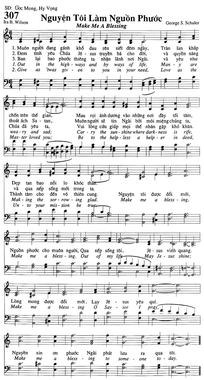 1. Muôn người đang gánh khổ đau rên siết đêm ngày, Tràn lan khắp chốn trên thế gian, Mau rọi ánh dương vào những nơi đây tối tăm, Dẹp tan bao nỗi lo khóc than. 2. Đem tình yêu Chúa Jêsus truyền bá cho đời, và quyền năng thoát ách Sa tan, Muôn người sẽ tin Ngài bởi môi miệng chúng ta, và qua nếp sống mới trong ta. 3. Ban lại bao phước thiêng ta nhận lãnh nơi Ngài. và yêu như Chúa đã yêu ta, Vui lòng cứu giúp mọi thế nhân gặp khó khăn. Thành tâm cho đến vô thiên cung. Điệp khúc: Nguyện tôi được đổi mới, Make me a blessing, Nguồn phước cho muôn người, Qua nếp sống tôi, Jêsus vinh quang. May Jesus shine; Lòng mong được đổi mới, Lạy Jesus yêu quí. Nguyện xin ơn phước Ngài phát lưu ra qua tôi.