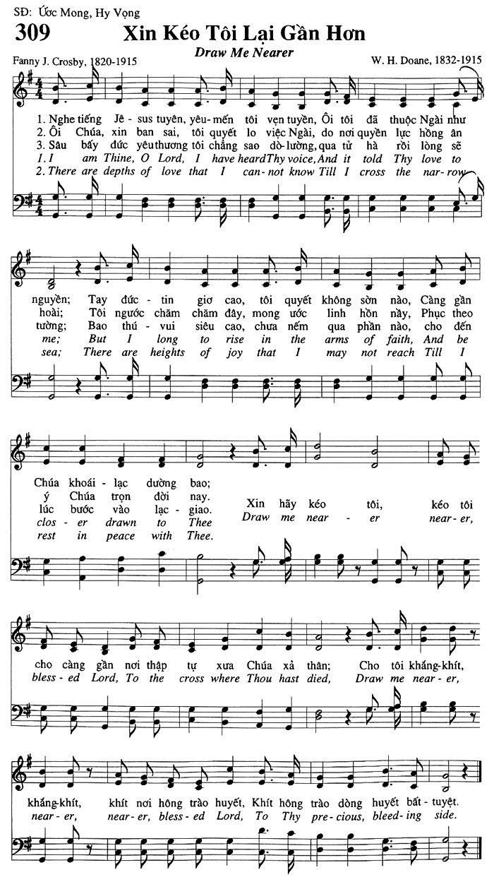 1. Nghe tiếng Jêsus tuyên, yêu-mến tôi vẹn tuyền, Ôi tôi đã thuộc Ngài như nguyền; Tay đức - tin giơ cao, tôi quyết không sờn nào, Càng gần Chúa khoái lạc dường bao; 2. Ôi Chúa, xin ban sai, tôi quyết lo việc Ngài, do nơi quyền lực hồng ân hoài; Tôi ngước chăm chăm đây, mong ước linh hồn này, Phục theo ý Chúa trọn đời nay. 3. Sâu bấy đức yêu thương tôi chẳng sao dò-lường, qua tử hà rồi lòng sẽ tường; Bao thú vui siêu cao, chưa nếm qua phần nào, cho đến lúc bước vào lạc - giao. Điệp khúc: Xin hãy kéo tôi, kéo tôi cho càng gần nơi thập tự xưa Chúa xả thân; Cho tôi khắng-khít, khít nơi hông trào huyết, Khít hông trào dòng huyết bất - tuyệt.