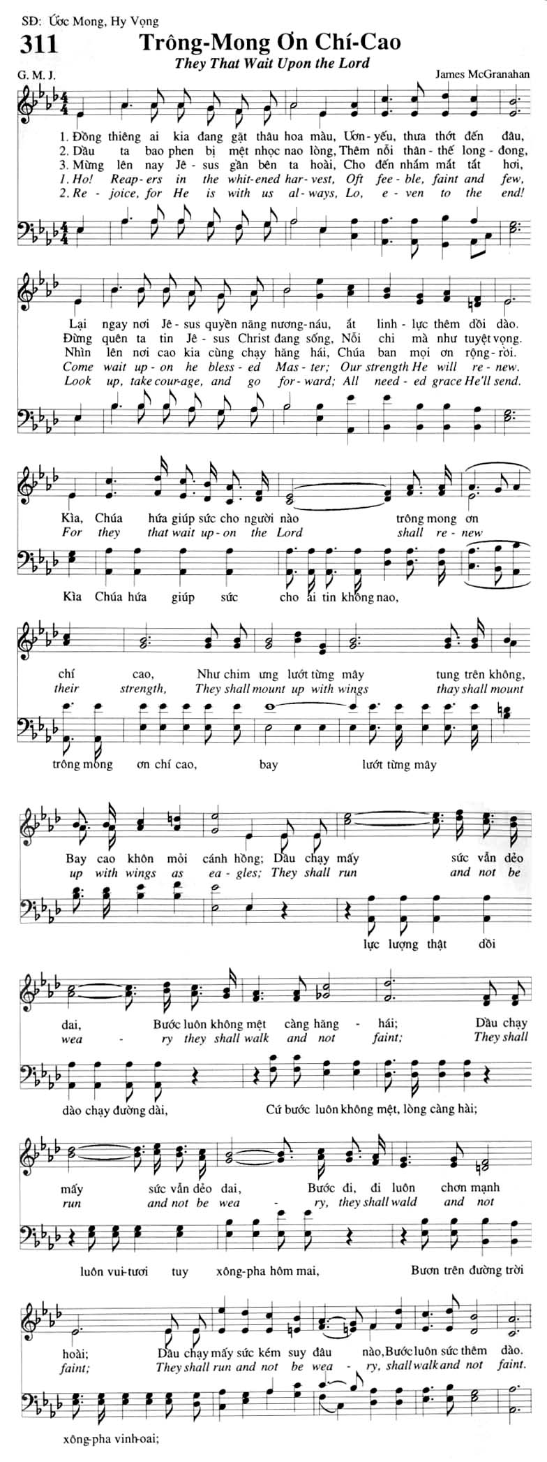 1. Đồng thiêng ai kia đang gặt thâu hoa màu, Ươn-yếu, thưa thớt đến đâu, Lại ngay nơi Jêsus quyền năng nương-náu, Bởi sức vẫn dẻo dai, Bước đi, đi luôn chơn mạnh luôn vui-tươi tuy xông-pha hôm mai, 2. Dầu ta bao phen bị mệt nhọc nao lòng, Thêm nỗi thân-thế long-đong, Đừng quên ta tin Jêsus Christ đang sống, Nỗi Bước luôn không mệt càng hăng-hái; Cứ bước luôn không mệt, lòng càng hài; 3. Mừng lên nay Jêsus gần bên ta hoài, Cho đến nhắm mắt tất hơi, Nhìn lên nơi cao kia cùng chạy hăng hái, Bay cao khôn mỏi cánh hồng; Dầu chạy mấy Dầu chạy mấy sức kém suy đâu nào, Bước luôn sức thêm dào. Điệp khúc: Kìa, Chúa hứa giúp sức cho người nào trông mong ơn shall re-new Kìa Chúa hứa giúp sức cho ai tin không nao, chí cao, Như chim ưng lướt từng mây tung trên không, thay shall mount trông mông ơn chí cao, bay lướt từng mây Bay cao khôn mỏi cánh hồng; Dầu chạy mấy sức vẫn dẻo and not be lực lượng thật dồi dai. Bước luôn không mệt càng hăng-hái; Dầu chạy dào chạy đường dài, Cứ bước luôn không mệt, lòng càng hài; mấy sức vẫn dẻo dai, Bước đi, đi luôn chơn mạnh luôn vui-tươi tuy xông-pha hôm mai, Bươn trên đường trời hoài; Dầu chạy mấy sức kém suy đâu nào, Bước luôn sức thêm dào. xông-pha vinh-oai;