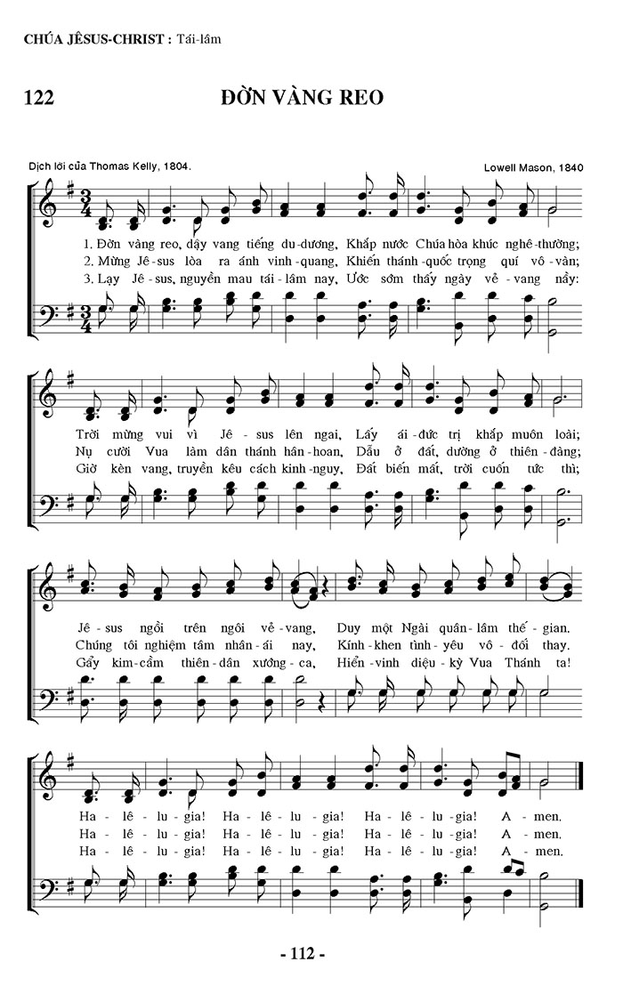 1. Đờn vàng reo, dậy vang tiếng du dương, Khắp nước Chúa hòa khúc nghe thường; Trời mừng vui vì Jê-sus lên ngai, Lấy ái đức trị khắp muôn loài; Jê-sus ngồi trên ngôi vẻ vang, Duy một Ngài quân-lâm thế gian. Ha-lê-lu-gia! Ha-lê-lu-gia! Ha-lê-lu-gia! A-men. 2. Mừng Jê-sus lòa ra ánh vinh-quang, Khiến thánh-quốc trọng quí vô-vàn; Nụ cười Vua làm dân thánh hân-hoan, Dẫu ở đất, dưỡng ở thiên-đàng; Chúng tôi nghiệm tâm nhân-ái nay, Kính-khen tình-yêu vô-đổi thay. Ha-lê-lu-gia! Ha-lê-lu-gia! Ha-lê-lu-gia! A-men. 3. Lạy Jê-sus, nguyền mau tái-lâm nay, Ước sớm thấy ngày vẻ-vang nầy: Giờ kèn vang, truyền kêu cách kinh-nguy, Đất biến mất, trời cuốn tức thì; Gẩy kim-cầm thiên-dân xướng-ca, Hiển-vinh diệu-kỳ Vua Thánh ta! Ha-lê-lu-gia! Ha-lê-lu-gia! Ha-lê-lu-gia! A-men.