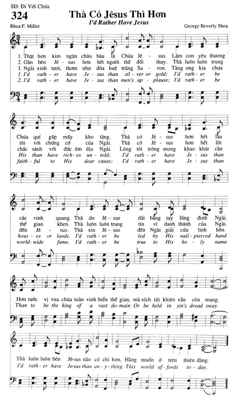 1. Thật hơn kim ngân châu báu là Chúa Jê-sus. Làm con yêu thương Chúa quí gấp mấy kho tàng. Thà có Jê-sus hơn hết lau các vinh quang. Thà do Jê-sus dắt bằng tay lũng đinh Ngài. Hơn tước vị vua chúa toàn vinh hiển thế gian, mà xích tội khiên vẫn còn mang. Thà luôn luôn bên Jê-sus nào có chỉ hơn, Hàng muốn ở trên thiên đàng. 2. Gần bên Jê-sus hơn hết người thế đổi thay. Thà luôn luôn trung tín với chứng cớ của Ngài. Thà có Jê-sus hơn hết lời thế gian khen. Thà luôn luôn trung tín vì danh thánh của Ngài. 3. Ngài xinh tươi, thơm như đóa huệ trũng Sa-ron. Tàng ong kia chưa chắc sánh với đức êm dịu Ngài. Lòng tôi trông mong khao khát cần đến Jê-sus. Thà xin Jê-sus đến Ngài giải cứu linh hồn.