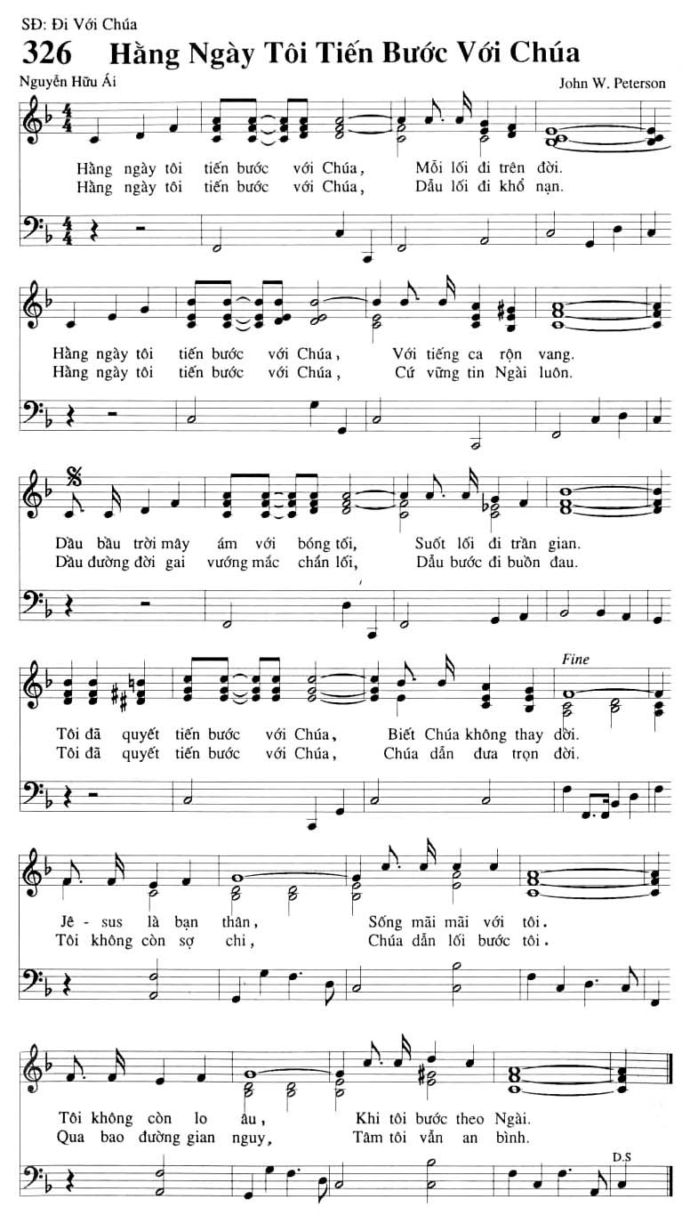 1. Hằng ngày tôi tiến bước với Chúa, Mỗi lối đi trên đời. Hằng ngày tôi tiến bước với Chúa, Với tiếng ca rộn vang. Dầu bầu trời mây ám với bóng tối, Suốt lối đi trần gian. Tôi đã quyết tiến bước với Chúa, Biết Chúa không thay dời. Je-sus là bạn thân, Sống mãi mãi với tôi. Tôi không còn lo âu, Khi tôi bước theo Ngài. 2. Hằng ngày tôi tiến bước với Chúa, Dẫu lối đi khổ nạn. Hằng ngày tôi tiến bước với Chúa, Cứ vững tin Ngài luôn. Dầu đường đời gai vướng mắc chán lối, Dầu bước đi buồn đau. Tôi đã quyết tiến bước với Chúa, Chúa dẫn đưa trọn đời. Tôi không còn sợ chi, Chúa dẫn lối bước tôi. Qua bao đường gian nguy, Tâm tôi vẫn an bình.