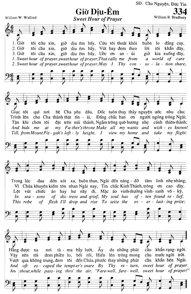 1. Giờ tôi cầu xin, giờ dịu êm bấy, Cứu tôi thoát khỏi buồn lo đắng cay, Giục tôi quì nơi bệ Cha yêu dấu, Dốc tuôn thay thảy nguyện ước nhu cầu; Trong lúc đau đớn xót xa, buồn than, Ngài đến nâng - đỡ tâm linh nhẹ nhàng, Hằng được xa nơi tà ma bẫy lưới, Ấy do những phút cầu khẩn rạng ngời. 2. Giờ tôi cầu xin, giờ dịu êm bấy, Vút bay đem theo lời tôi khẩn đây, Trình lên cho Cha thành thật tín ái, Đấng chắc ban ơn người ngóng trông Ngài; Vì Chúa khuyên kiếm tôn nhan Ngài nay, Tin chắc Kinh Thánh, trông ơn cao dày, Vậy nên tôi đem phiền lo, bối rối, Hiến lên trông mong cầu trước ngôi trời. 3. Giờ tôi cầu xin, giờ dịu êm bấy, Ước ơn an ủi giờ kia xuống đây, Tận khi chơn tôi đặt trên núi thánh, Ngắm trông quê hương nhẹ cánh thiên thành; Lột vút chiếc áo hay hư này đi, Mặc áo vinh thưởng vĩnh - sanh vô kỳ, Vượt qua không trung, đem tôi đến Chúa, phước thay những phút cầu khẩn bên Ngài.