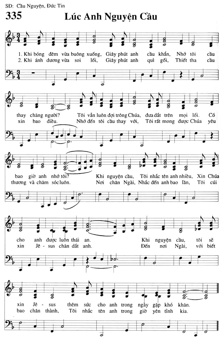 1. Khi bóng đêm vừa buông xuống, Giây phút anh cầu khẩn, Nhớ tôi cầu thay chăng người? Tôi vẫn luôn đợi trông Chúa, đưa dắt trên mọi lối. Có bao giờ anh nhớ tôi? Khi nguyện cầu, Tôi nhắc tên anh nhiều, Xin Chúa cho anh được luôn thái an. Khi nguyện cầu, tôi sẽ xin Je-sus thêm sức cho anh trong ngày gặp khó khăn. 2. Khi ánh dương vừa soi lối, Giây phút anh quì gối, Thiết tha cầu xin bao điều. Nhớ đến tôi cầu thay với, Tôi rất mong được Chúa yêu thương và chăm sóc luôn. Nơi chân Ngài, Nhắc đến anh bao lần, Tôi cúi xin Je-sus chăn dắt anh. Đến nơi Ngài, với biết bao chân thành, Tôi nhắc tên anh trong giờ yên tĩnh kia.
