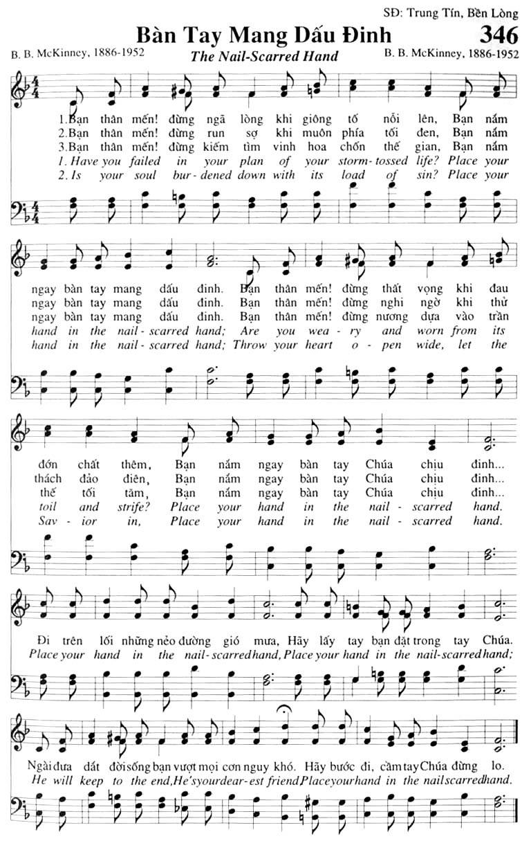 1. Bạn thân mến! đừng ngã lòng khi giông tố nỗi lên, Bạn nắm ngay bàn tay mang dấu đinh. Bạn thân mến! đừng thất vọng khi đau đớn chất thêm, Bạn nắm ngay bàn tay Chúa chịu đinh... Have you failed in your plan of your storm-tossed life? Place your hand in the nail-scarred hand; Are you weary and worn from its toil and strife? Place your hand in the nail-scarred hand. 2. Bạn thân mến! đừng run sợ khi muôn phía tối đen, Bạn nắm ngay bàn tay mang dấu đinh. Bạn thân mến! đừng nghi ngờ khi thử thách đảo điên, Bạn nắm ngay bàn tay Chúa chịu đinh... Is your soul burdened down with its load of sin? Place your hand in the nail-scarred hand; Throw your heart open wide, let the Savior in, Place your hand in the nail-scarred hand. 3. Bạn thân mến! đừng kiếm tìm vinh hoa chốn thế gian, Bạn nắm ngay bàn tay mang dấu đinh. Bạn thân mến! đừng nương dựa vào trần thế tối tăm, Bạn nắm ngay bàn tay Chúa chịu đinh... Điệp khúc: Đi trên lối những nẻo đường gió mưa, Hãy lấy tay bạn đặt trong tay Chúa. Ngài đưa dắt đời sống bạn vượt mọi cơn nguy khó. Hãy bước đi, cầm tay Chúa đừng lo. Place your hand in the nail-scarred hand, Place your hand in the nail-scarred hand; He will keep to the end, He's your dear-est friend Place your hand in the nail-scarred hand.