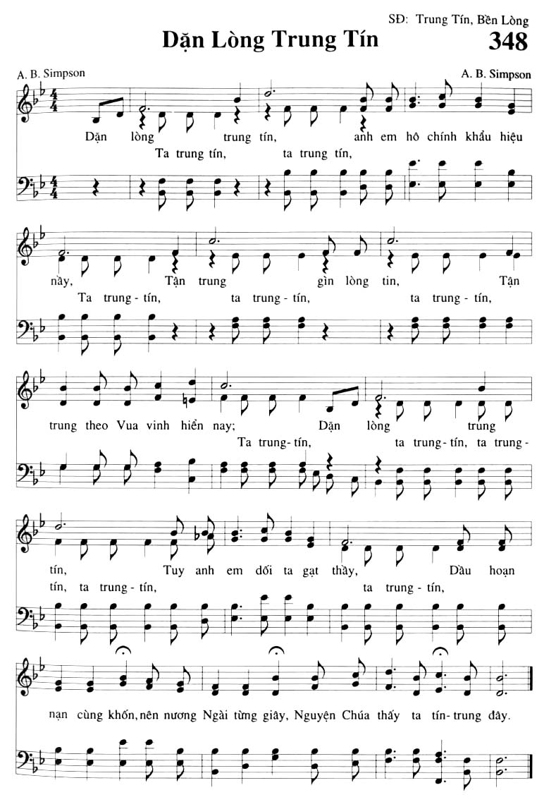 1. Dặn lòng trung tín, anh em hô chính khẩu hiệu này, Tận trung gìn lòng tin, ta trung tín, ta trung tín, ta trung tín, trung theo Vua vinh hiển nay; Dặn lòng trung tín, ta trung tín, ta trung tín, ta trung tín, Tuy anh em dối ta gạt thầy, Dầu hoạn nạn cùng khốn, nên nương Ngài từng giây, Nguyện Chúa thấy ta tín- trung đây. 2. Dặn lòng trung tín, anh em hô chính khẩu hiệu này, Tận trung gìn lòng tin, ta trung tín, ta trung tín, ta trung tín, trung theo Vua vinh hiển nay; Dặn lòng trung tín, ta trung tín, ta trung tín, ta trung tín, Tuy anh em dối ta gạt thầy, Dầu hoạn nạn cùng khốn, nên nương Ngài từng giây, Nguyện Chúa thấy ta tín- trung đây. 3. Dặn lòng trung tín, anh em hô chính khẩu hiệu này, Tận trung gìn lòng tin, ta trung tín, ta trung tín, ta trung tín, trung theo Vua vinh hiển nay; Dặn lòng trung tín, ta trung tín, ta trung tín, ta trung tín, Tuy anh em dối ta gạt thầy, Dầu hoạn nạn cùng khốn, nên nương Ngài từng giây, Nguyện Chúa thấy ta tín- trung đây.
