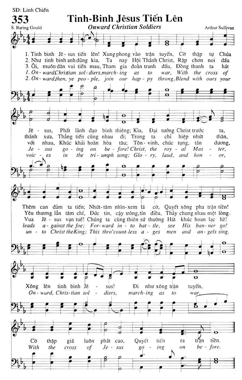 1. Tinh binh Jêsus tiến lên! Xung phong vào trận tuyến, Cờ thập tự Chúa Jêsus, Phất lãnh đạo binh thiêng; Kìa, Đại tướng Christ trước ta, Xông lên tinh binh Jêsus! Đi như xông trận tuyến, Cờ thập giá luôn phất cao, Quyết tiến ra trận tiền. 2. Như tỉnh binh anh dũng kia, Ta nay Hội Thánh Christ, Rập chơn noi dấu thánh xưa, Thẳng tiến cùng nhau đi; Trong ta chỉ hiệp nhứt thân, Thêm can đảm ta tiến; Nhứt-tâm nhìn-xem lá cờ, Quyết xông pha trận tiền! Cờ thập giá luôn phất cao, Quyết tiến ra trận tiền. 3. Ôi, muôn dân vui tiến mau, Tham gia đoàn tranh đấu, Đồng thanh ta hát với nhau, Khúc khải hoàn hòa tâu; Tôn vinh, chúc tụng, tán dương, Vua Jêsus vạn tuế! Chúng ta cùng thiên sứ thường Hát khúc hoan lạc hề! Cờ thập giá luôn phất cao, Quyết tiến ra trận tiền. Điệp khúc: Onward Christian soldiers, marching as to war, With the cross of Jesus going on before! Christ, the royal Master, Onward then, ye people, join our happy throng, Blend with ours your voices in the triumph song; Glory, laud, and honor, leads against the foe; Forward in to battle, see His banner go! unto Christ the King; This thro'countless ages men and angels sing. Onward, Christian soldiers, marching as to war, With the cross of Jesus going on before.
