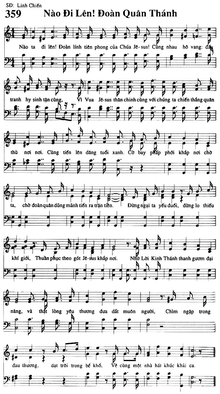 1. Nào ta đi lên! Đoàn lính tiên phong của Chúa Jê-sus! Cùng nhau hô vang: đấu tranh hy sinh tận cùng, Vì Vua Jê-sus thân chinh cùng với chúng ta chiến thắng quân thù nơi nơi. Cùng tiến lên dâng tuổi xanh. Cờ bay phấp phới khắp nơi chờ ta, chờ đoàn quân dũng mãnh tiến ra trận tiền. Đừng ngại ta yếu đuối, đừng lo thiếu khí giới, Thuần phục theo gót Jê-sus khắp nơi. Nhờ Lời Kinh Thánh thanh gươm đại năng, và thật lòng yêu thương đưa dắt muôn người, Chìm ngập trong đau thương. dạt trôi trong bể khổ. Về cùng một nhà hát khúc khải ca. 2. Nào ta đi lên! Đoàn lính tiên phong của Chúa Jê-sus! Cùng nhau hô vang: đấu tranh hy sinh tận cùng, Vì Vua Jê-sus thân chinh cùng với chúng ta chiến thắng quân thù nơi nơi. Cùng tiến lên dâng tuổi xanh. Cờ bay phấp phới khắp nơi chờ ta, chờ đoàn quân dũng mãnh tiến ra trận tiền. Đừng ngại ta yếu đuối, đừng lo thiếu khí giới, Thuần phục theo gót Jê-sus khắp nơi. Nhờ Lời Kinh Thánh thanh gươm đại năng, và thật lòng yêu thương đưa dắt muôn người, Chìm ngập trong đau thương. dạt trôi trong bể khổ. Về cùng một nhà hát khúc khải ca. 3. Nào ta đi lên! Đoàn lính tiên phong của Chúa Jê-sus! Cùng nhau hô vang: đấu tranh hy sinh tận cùng, Vì Vua Jê-sus thân chinh cùng với chúng ta chiến thắng quân thù nơi nơi. Cùng tiến lên dâng tuổi xanh. Cờ bay phấp phới khắp nơi chờ ta, chờ đoàn quân dũng mãnh tiến ra trận tiền. Đừng ngại ta yếu đuối, đừng lo thiếu khí giới, Thuần phục theo gót Jê-sus khắp nơi. Nhờ Lời Kinh Thánh thanh gươm đại năng, và thật lòng yêu thương đưa dắt muôn người, Chìm ngập trong đau thương. dạt trôi trong bể khổ. Về cùng một nhà hát khúc khải ca.
