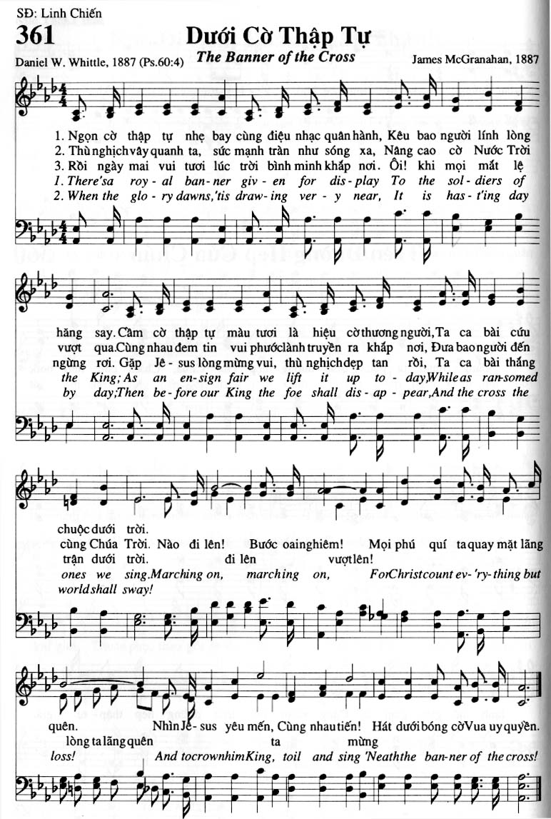 1. Ngọn cờ thập tự nhẹ bay cùng điệu nhạc quân hành, Kêu bao người lính lòng hăng say. Cầm cờ thập tự màu tươi là hiệu cờ thương người, Ta ca bài cứu chuộc dưới trời. ones we sing. Marching on, marching on, world shall sway! 2. Thù nghịch vây quanh ta, sức mạnh tràn như sóng xa, Nâng cao cờ Nước Trời vượt qua. Cùng nhau đem tin vui phước lành truyền ra khắp nơi, Đưa bao người đến cùng Chúa Trời. Nào đi lên! Bước oai nghiêm! Mọi phú quí ta quay mặt lãng quên. 3. Rồi ngày mai vui tươi lúc trời bình minh khắp nơi. Ôi! khi mọi mắt lệ ngừng rơi. Gặp Jê-sus lòng mừng vui, thù nghịch dẹp tan rồi, Ta ca bài thắng trận dưới trời. đi lên vượt lên! For Christ count ev-'ry-thing but loss! Điệp khúc: Nhìn Jê-sus yêu mến, Cùng nhau tiến! Hát dưới bóng cờ Vua uy quyền. lòng ta lãng quên ta mừng And to crown him King, toil and sing 'Neath the ban-ner of the cross!