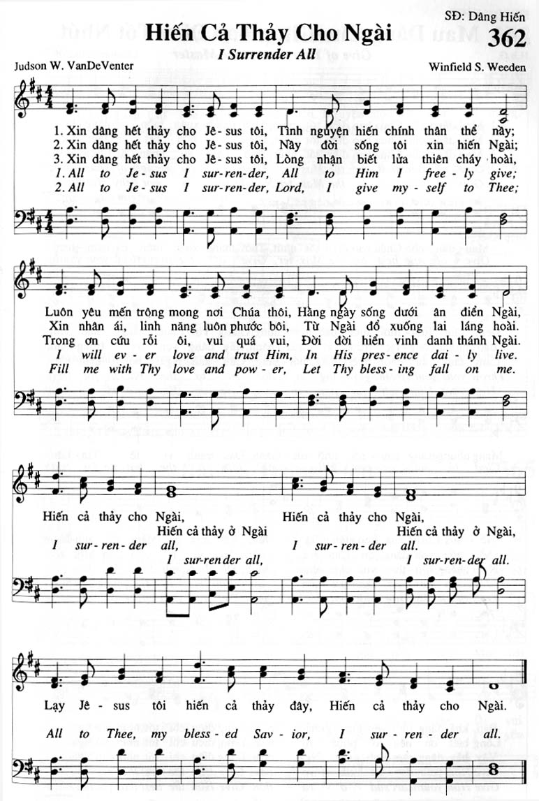 1. Xin dâng hết thảy cho Jê-sus tôi, Tình nguyện hiến chính thân thể này; Luôn yêu mến trông mong nơi Chúa thôi, Hằng ngày sống dưới ân điển Ngài, I will ev-er love and trust Him, In His pres-ence dai-ly live. 2. Xin dâng hết thảy cho Jê-sus tôi, Này đời sống tôi xin hiến Ngài; Xin nhân ái, linh năng luôn phước bôi, Từ Ngài đổ xuống lai láng hoài. Fill me with Thy love and pow-er, Let Thy bless-ing fall on me. 3. Xin dâng hết thảy cho Jê-sus tôi, Lòng nhận biết lửa thiên cháy hoài, Trong ơn cứu rỗi ôi, vui quá vui, Đời đời hiển vinh danh thánh Ngài. Điệp khúc: Hiến cả thảy cho Ngài, Hiến cả thảy ở Ngài I sur-ren-der all, I sur-render all, Hiến cả thảy cho Ngài, Hiến cả thảy ở Ngài, I sur-ren-der all. I sur-ren-der all. Lạy Jê-sus tôi hiến cả thảy đây, Hiến cả thảy cho Ngài. All to Thee, my bless-ed Sav-ior, I sur-ren-der all.